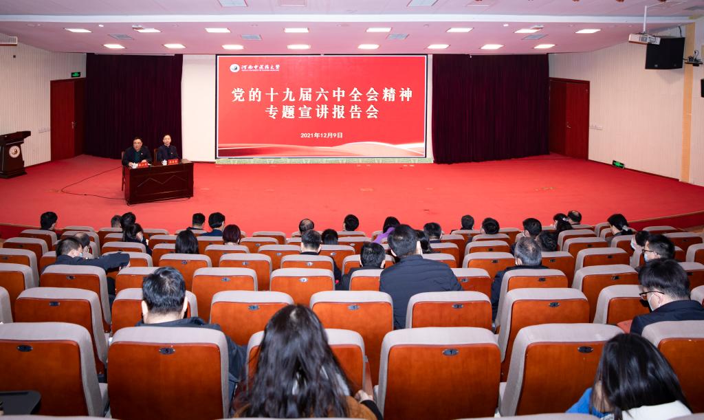 本网讯(文/赵会杰 图/秦东仁)为深入学习贯彻党的十九届六中全会精神,引导全校师生全面准确把握全会精神的核心要义和主旨精髓,真正做到深学细悟、入脑入心、指导实践。2021年12月9日上午,河南省社科联党组书记、主席李庚香应邀来leyu·乐鱼(中国)体育官方网站作党的十九届六中全会精神专题宣讲报告。学校全体校领导、中层干部、支部书记、辅导员、民主党派及无党派人士代表等800余人分别在图书馆第一报告厅主会场和25个分会场通过现场聆听和视频直播的方式集中收听收看报告会,报告会由校党委副书记、工会主席张小平主持。