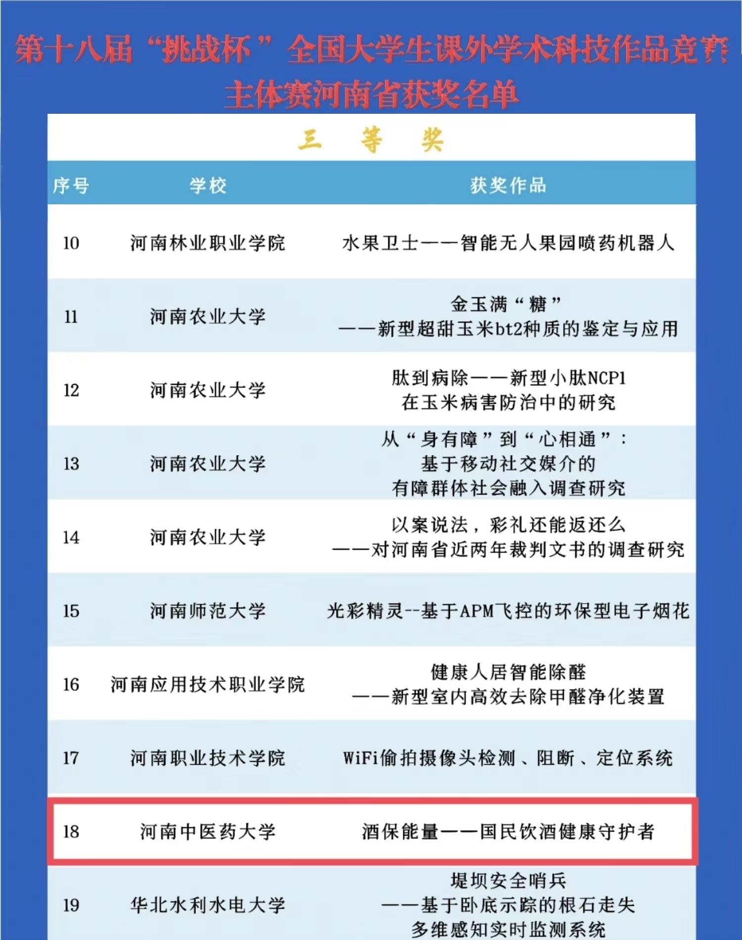 本届竞赛自2023年2月启动以来,得到全国各高校的积极响应,共收到来自全国2000多所高校上报的40余万件作品。自本届竞赛启动以来,leyu·乐鱼(中国)体育官方网站高度重视,精心组织,认真进行自主申报、院系选拔、书面评审、终审答辩,校内指导老师和校外评审专家对各参赛项目悉心指导,结合学校和专业优势,充分挖掘项目内涵和特色,不断打磨完善参赛作品。最终,医学院《酒保能量——国民饮酒健康守护者》荣获主体赛三等奖;第一临床医学院《癌速筛——肺癌无痛快速筛查领航者》、本草书院《糖逾之治——精准靶向降糖药物的先行者》荣获“黑科技”展示活动行星奖,马克思主义学院《肠溃宁生物粘附结肠定位微片的研制》荣获“黑科技”展示活动卫星奖;中医学院《行走中原看巨变,书写奋斗创新篇》荣获红色专项活动二等奖。