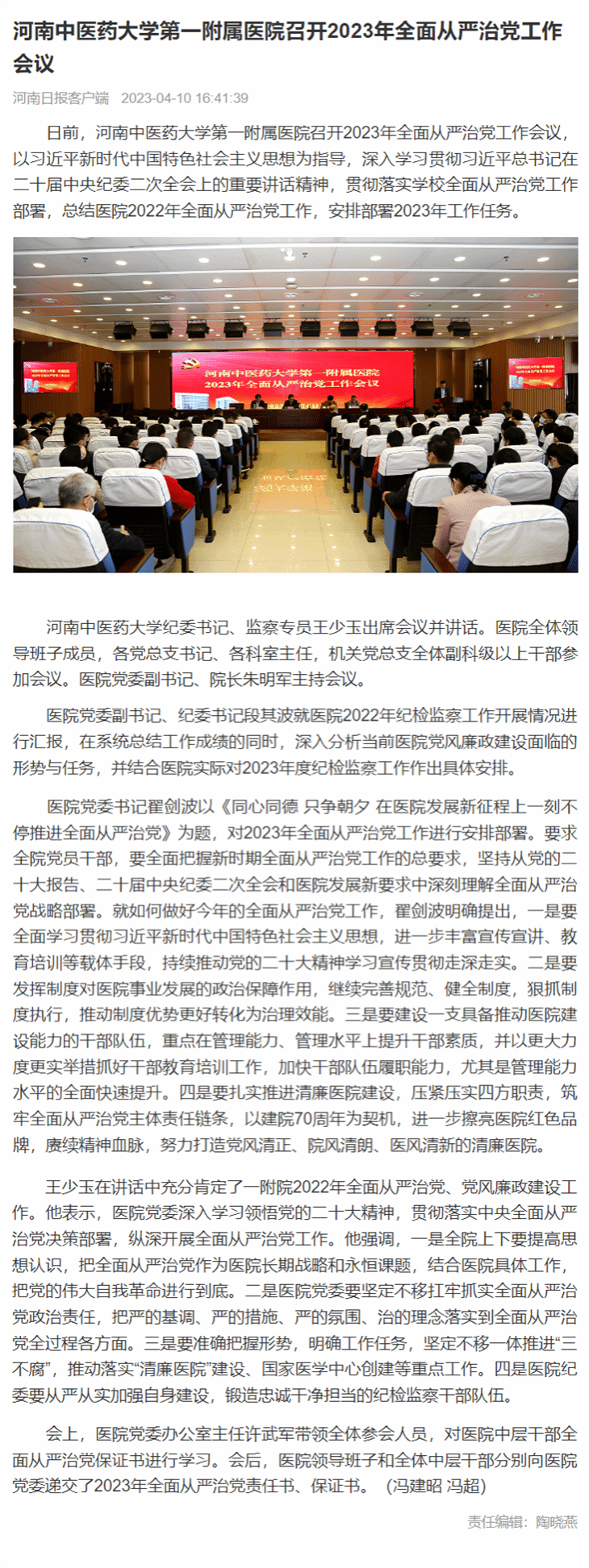 河南日报丨leyu·乐鱼(中国)体育官方网站第一附属医院召开2023年全面从严治党工作会议