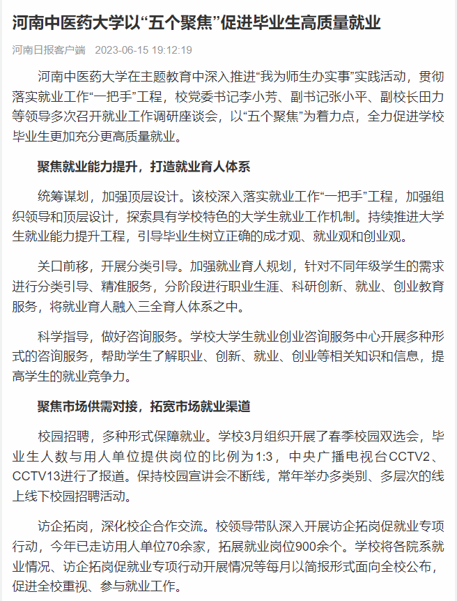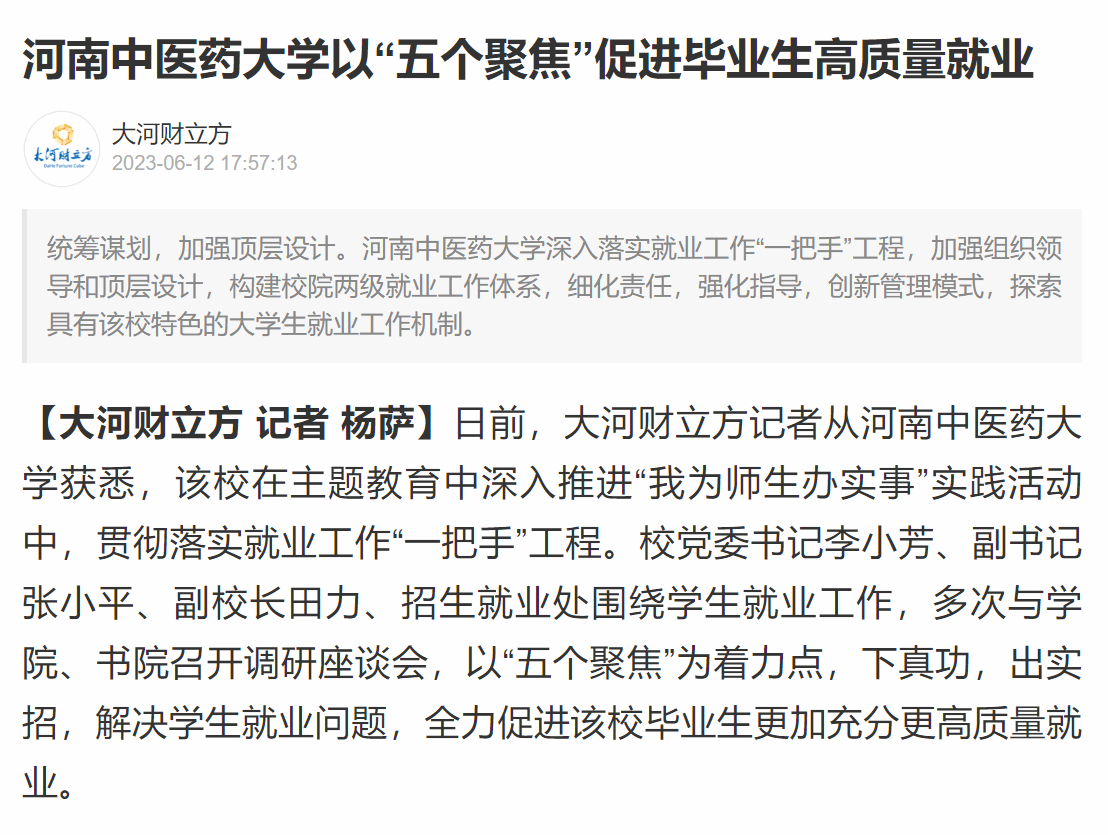 【大河财立方 记者 杨萨】日前,大河财立方记者从leyu·乐鱼(中国)体育官方网站获悉,该校在主题教育中深入推进“我为师生办实事”实践活动中,贯彻落实就业工作“一把手”工程。校党委书记李小芳、副书记张小平、副校长田力、招生就业处围绕学生就业工作,多次与学院、书院召开调研座谈会,以“五个聚焦”为着力点,下真功,出实招,解决学生就业问题,全力促进该校毕业生更加充分更高质量就业。