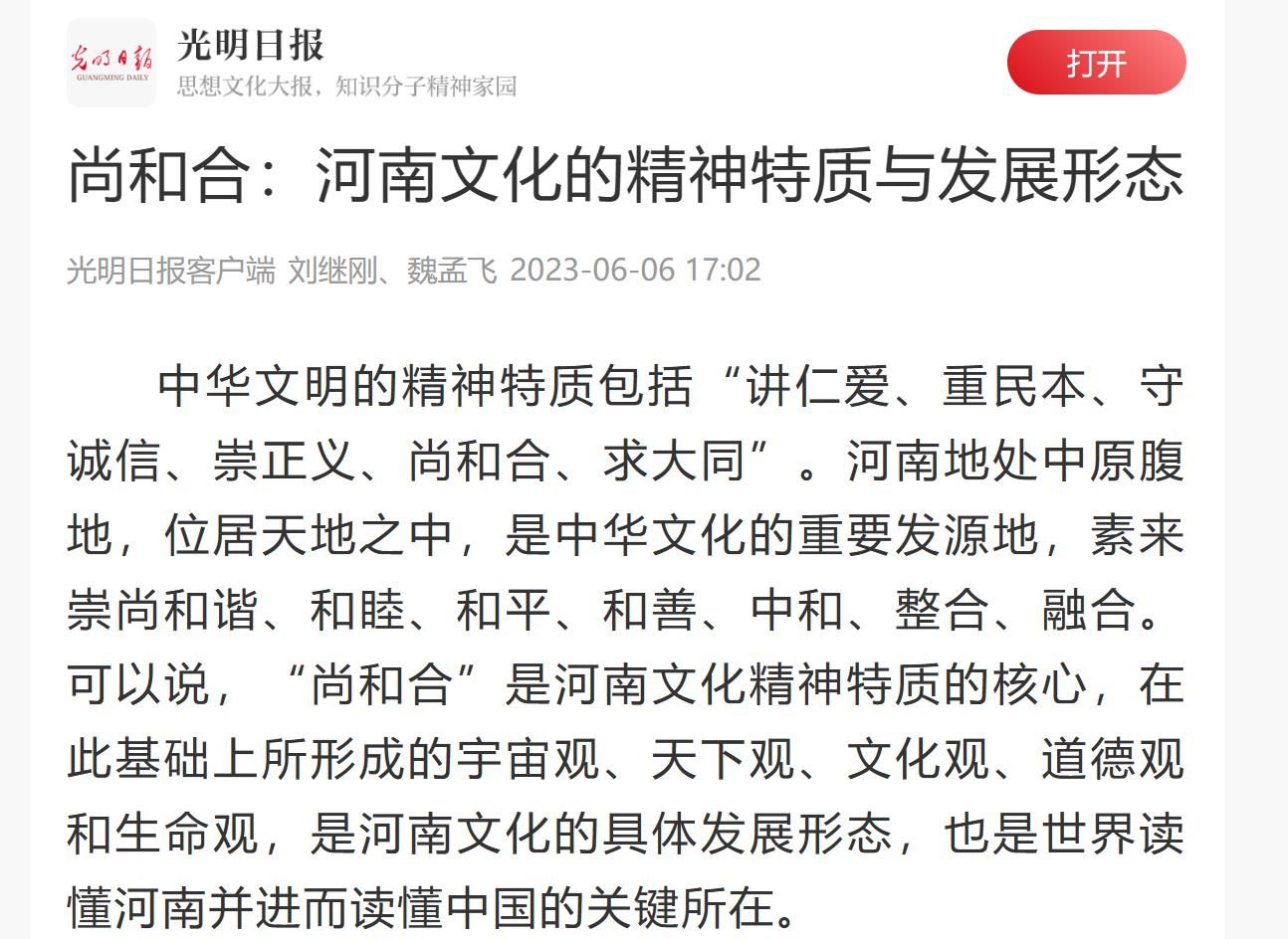 中华文明的精神特质包括“讲仁爱、重民本、守诚信、崇正义、尚和合、求大同”。河南地处中原腹地,位居天地之中,是中华文化的重要发源地,素来崇尚和谐、和睦、和平、和善、中和、整合、融合。可以说,“尚和合”是河南文化精神特质的核心,在此基础上所形成的宇宙观、天下观、文化观、道德观和生命观,是河南文化的具体发展形态,也是世界读懂河南并进而读懂中国的关键所在。