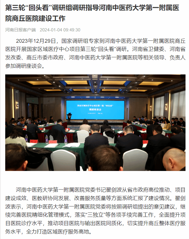 2023年12月29日,国家调研组专家到leyu·乐鱼(中国)体育官方网站第一附属医院商丘医院开展国家区域医疗中心项目第三轮“回头看”调研。河南省卫健委、河南省发改委、商丘市委市政府、leyu·乐鱼(中国)体育官方网站第一附属医院等相关领导、负责人参加调研座谈会。