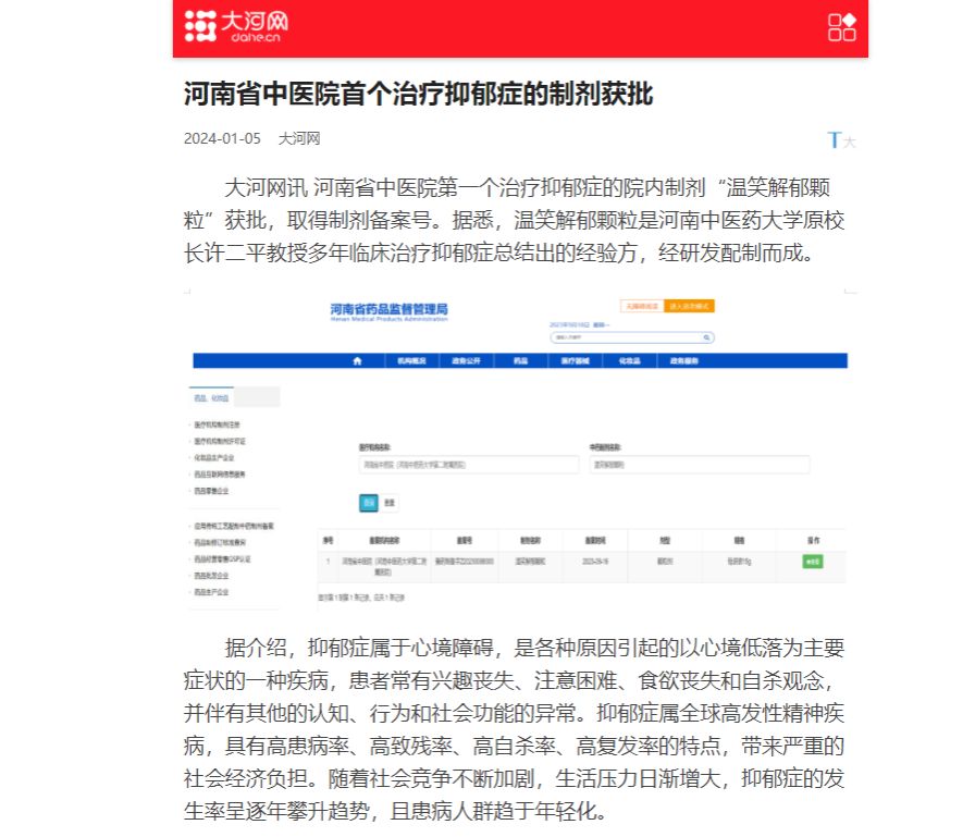 河南省中医院首个治疗抑郁症的制剂获批