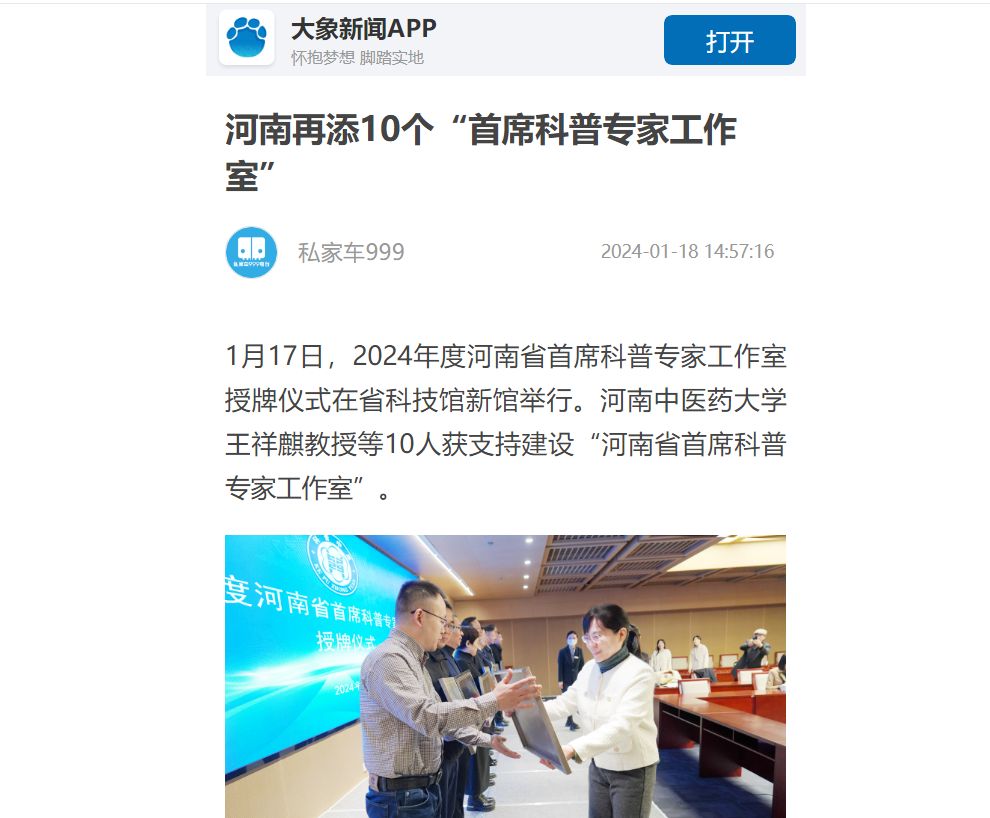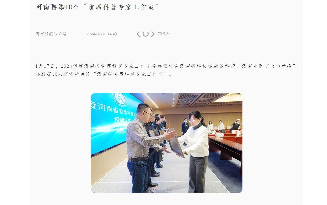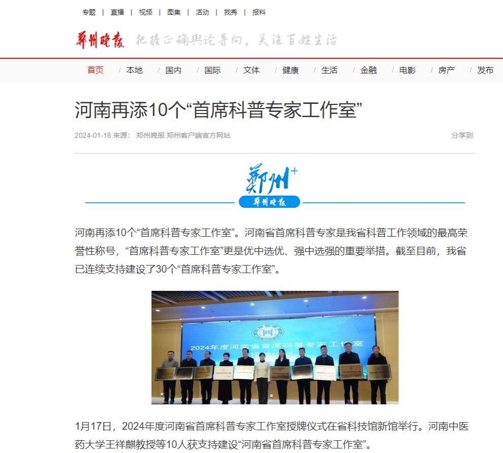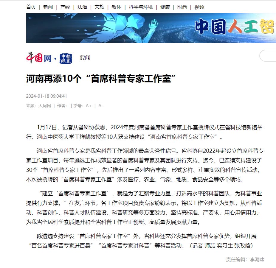 1月17日,记者从省科协获悉,2024年度河南省首席科普专家工作室授牌仪式在省科技馆新馆举行。leyu·乐鱼(中国)体育官方网站王祥麒教授等10人获支持建设“河南省首席科普专家工作室”。