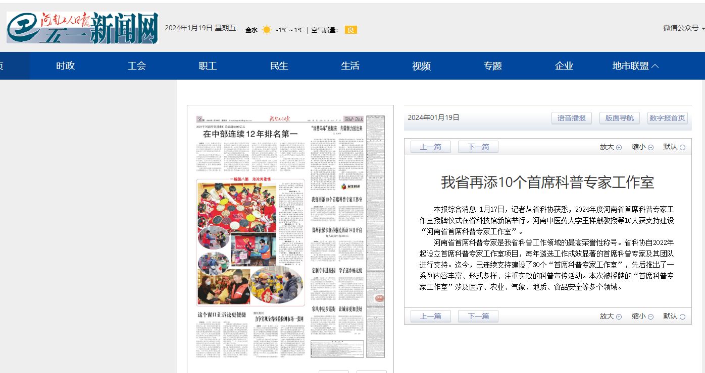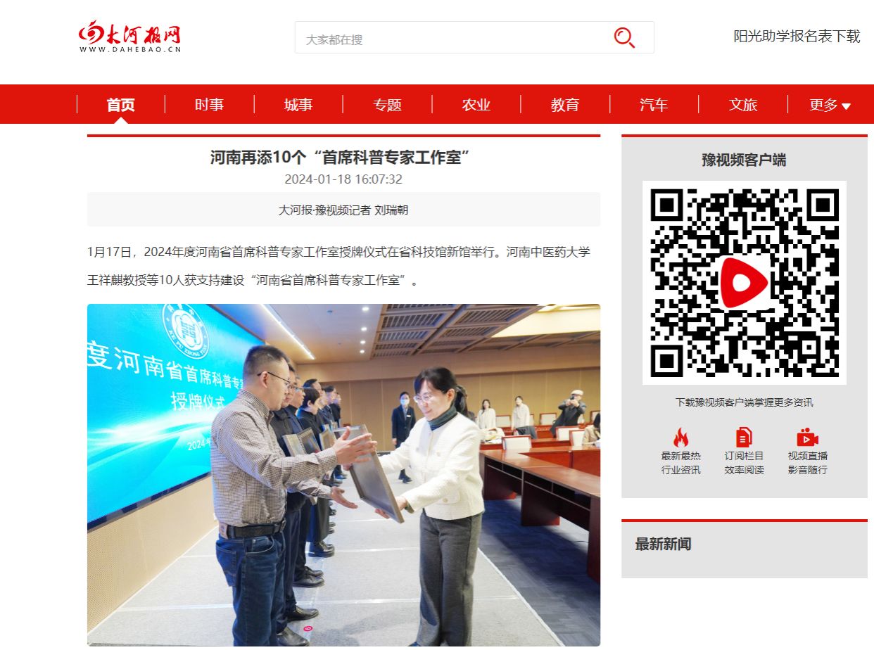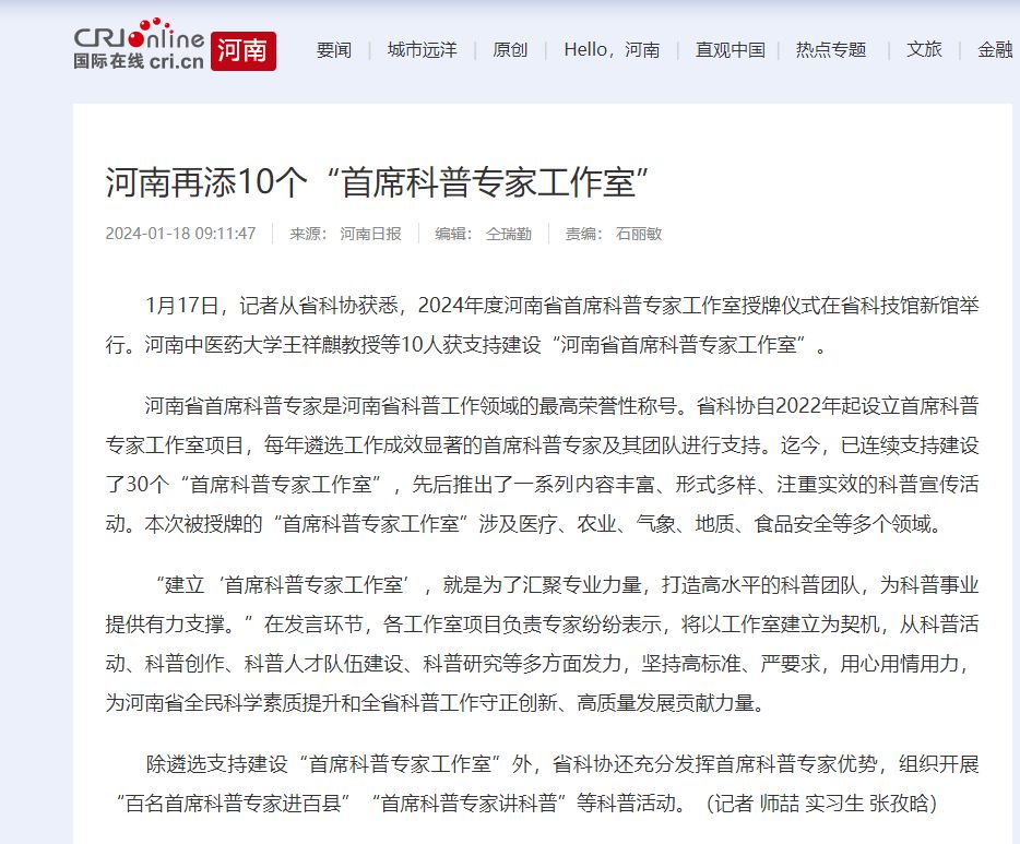 1月17日,记者从省科协获悉,2024年度河南省首席科普专家工作室授牌仪式在省科技馆新馆举行。leyu·乐鱼(中国)体育官方网站王祥麒教授等10人获支持建设“河南省首席科普专家工作室”。