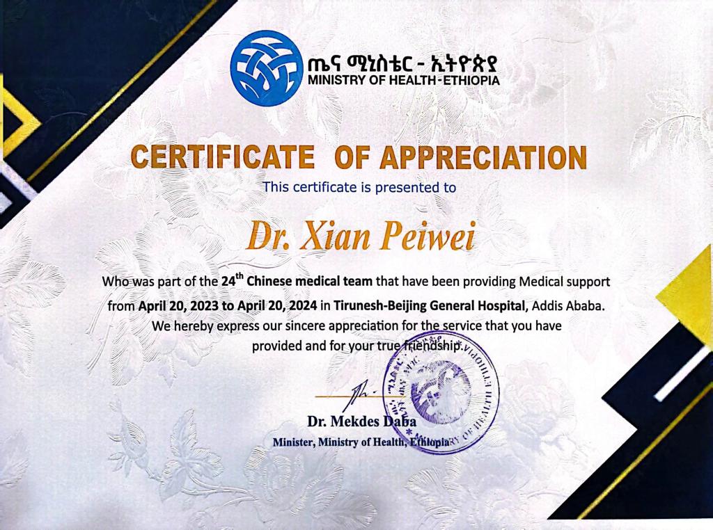 埃塞俄比亚联邦民主共和国卫生部荣誉证书