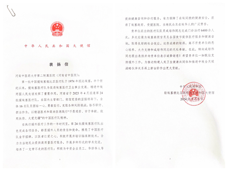 二附院高度重视援外医疗工作,始终将援外医疗工作视为具有长期战略意义的政治任务和重要的社会责任,多次选拔经验丰富、技术精湛的医疗专家参与国家援外医疗队并提供了全面的支持,高质高效圆满完成了上级交给的各项援助任务。今后医院还将积极参与各项医疗援助和卫生健康交流合作,为推动构建人类卫生健康共同体贡献更多的力量。