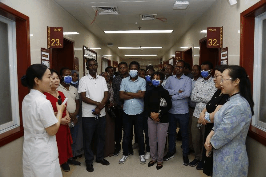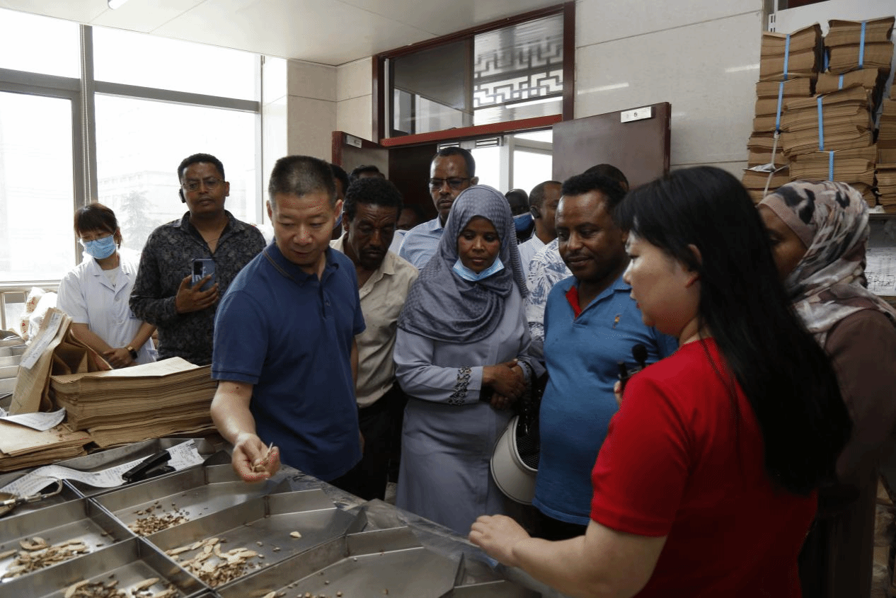 埃塞俄比亚代表团一行先后来到儿科、公共卫生医学中心、门诊药房、国医堂、中医护理技术门诊等地实地参观,各科室负责人分别向来宾介绍了儿科外治、中药药性药理、中医护理技术等中医特色诊疗技术,并与来访人员进行深入交流。