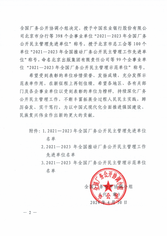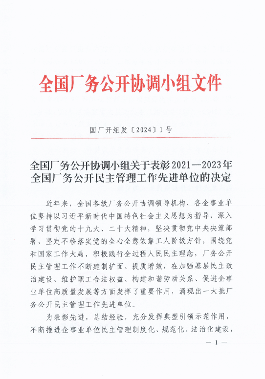 本网讯(文/王倩 吴金苗)近日,全国厂务公开协调领导小组印发了《关于表彰2021-2023年全国厂务公开民主管理工作先进单位的决定》,三附院被授予“2021-2023年全国厂务公开民主管理先进单位”称号。也是全省唯一一所获此殊荣的医院单位。