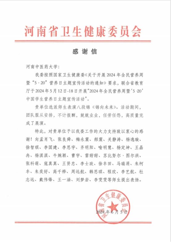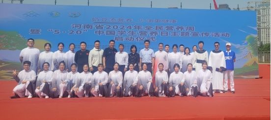 本网讯(文图/关静涛)近日,由河南省卫生健康委、河南省教育厅主办的“2024年全民营养周暨5·20中国学生营养日主题宣传活动”启动仪式在郑州国际会展中心如意湖广场隆重举行,leyu·乐鱼(中国)体育官方网站党委委员、副校长张振强受邀出席开幕式。体育学院创编的舞台剧《锦向未来》参加开幕式演出,得到了现场领导、嘉宾及观众的一致好评。河南省卫健委特寄来感谢信,向参与节目编排、演出的师生致以谢意。