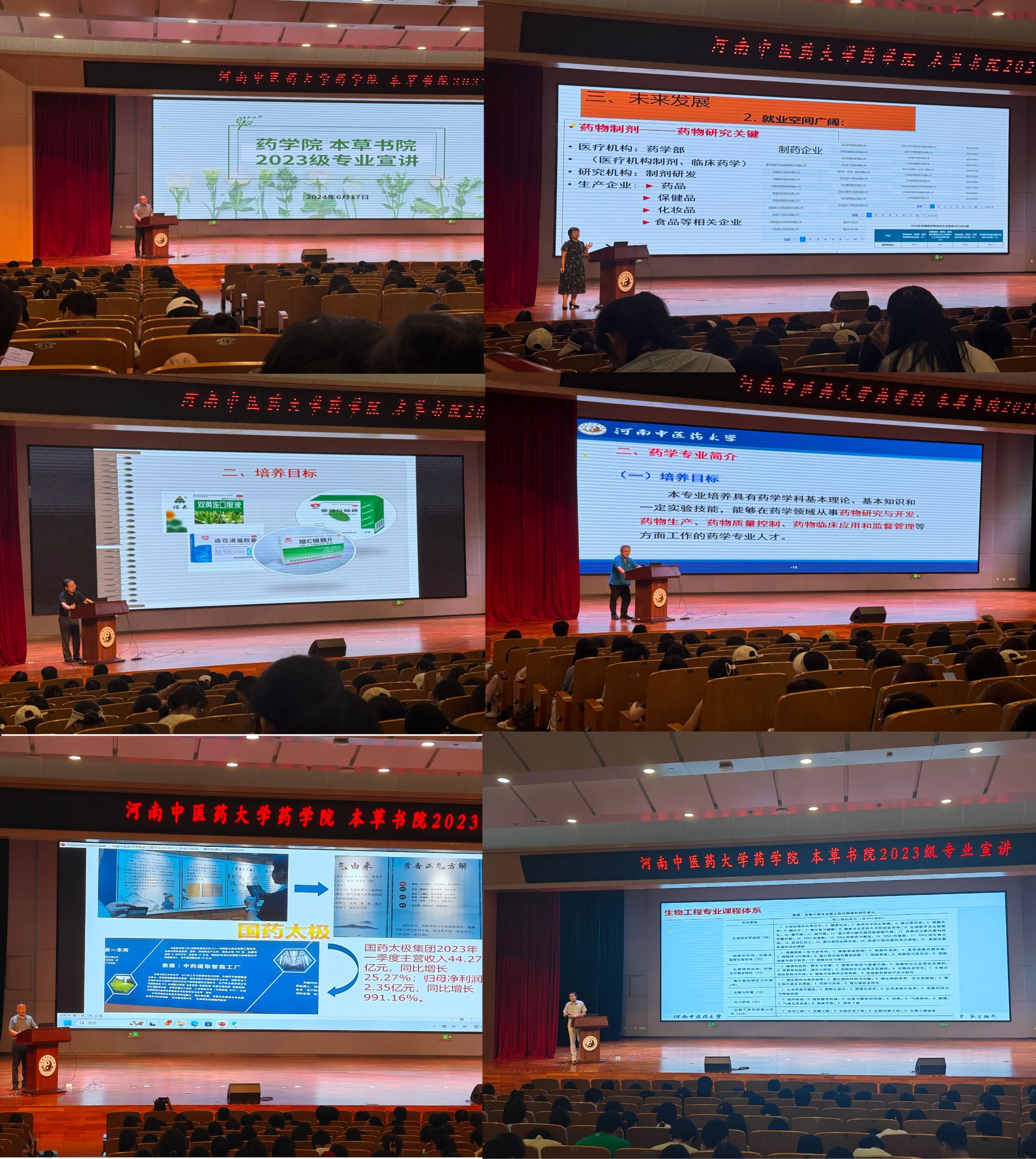本网讯(文/高巍 图/卢杰珂)为增强2023级同学的专业认同感,激发同学们学习的积极性、主动性,培养基础扎实、综合能力过硬的创新型人才,同时帮助同学们在专业分流中根据自己的特点选择适合自己的专业,药学院、本草书院于2024年6月17日在俊学楼B01开展专业宣讲。药学院各专业负责人、学科教师主讲,本草书院2023级全体同学参加。