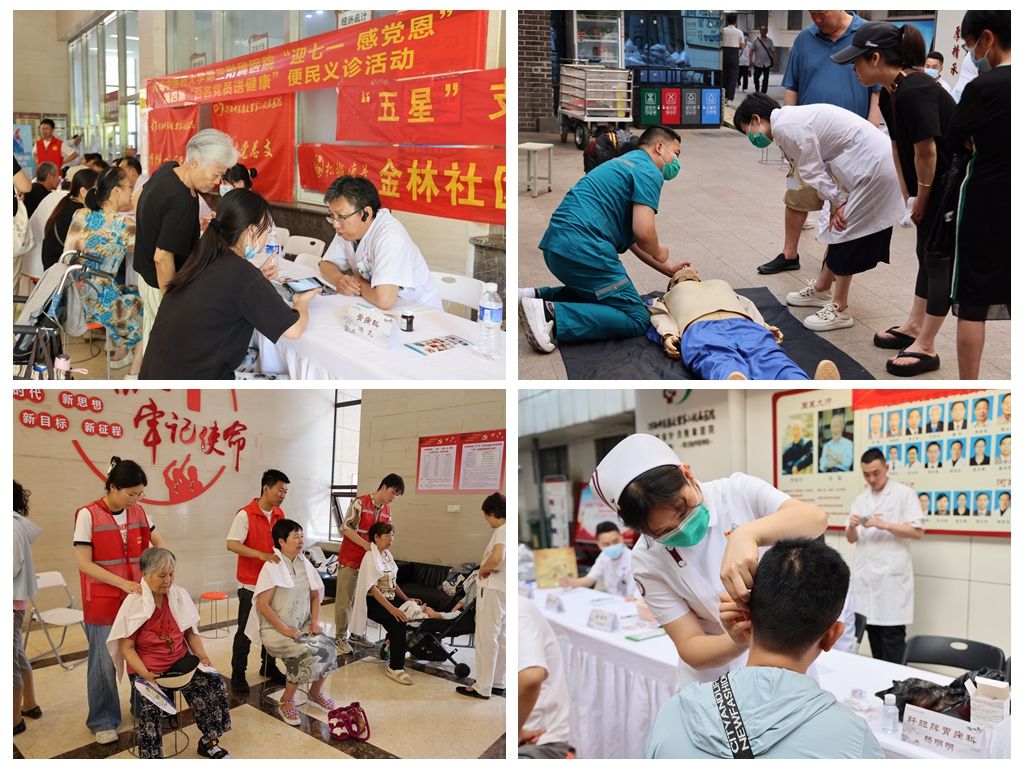 在聂庄路与纬四路交叉口东南角的聂庄村,党员们为群众把脉问诊、遣方用药和健康指导。开展了推拿、针灸、刮痧、拔罐、艾灸、三伏贴、耳穴贴压等中医特色疗法。在金林社区、银基花园社区和金色港湾社区,党员专家们为社区群众测量血压、穴位贴敷,对夏季常见病、多发病进行健康科普和用药咨询,大家对中医疗法赞不绝口。向群众发放“静音广场舞、规范暴走团、文明健步走”倡议书,引导群众加强自律,文明健身,营造文明和谐、绿色环保健康的社会氛围;党员们对社区内三家孤寡老人进行送医上门服务,在社区工作人员陪同下对孤寡老人进行了身体检查,并嘱咐用药事项。在三附院医院草药房大厅,前来问诊的患者络绎不绝。急诊科医师演示了心肺复苏和海姆立克急救法以及120正确拨打方法等,受到了社区居民的欢迎和称赞。党员耐心地为患者答疑解忧、把脉诊疗、辨证施治。党员们为群众讲解了中医药相关的科普知识,指导群众运用讲授知识防治疾病。