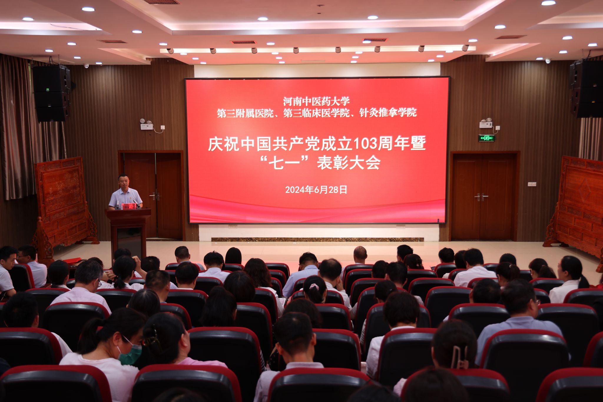 本网讯(文/李冕 图/田辉 潘向昆)2024年6月28日,三附院召开庆祝中国共产党成立103周年暨“七一”表彰大会。在郑院领导、各基层党组织书记、中层干部代表、党员代表、受表彰人员代表等参加了大会。医院党委副书记、院长胡仕祥主持。