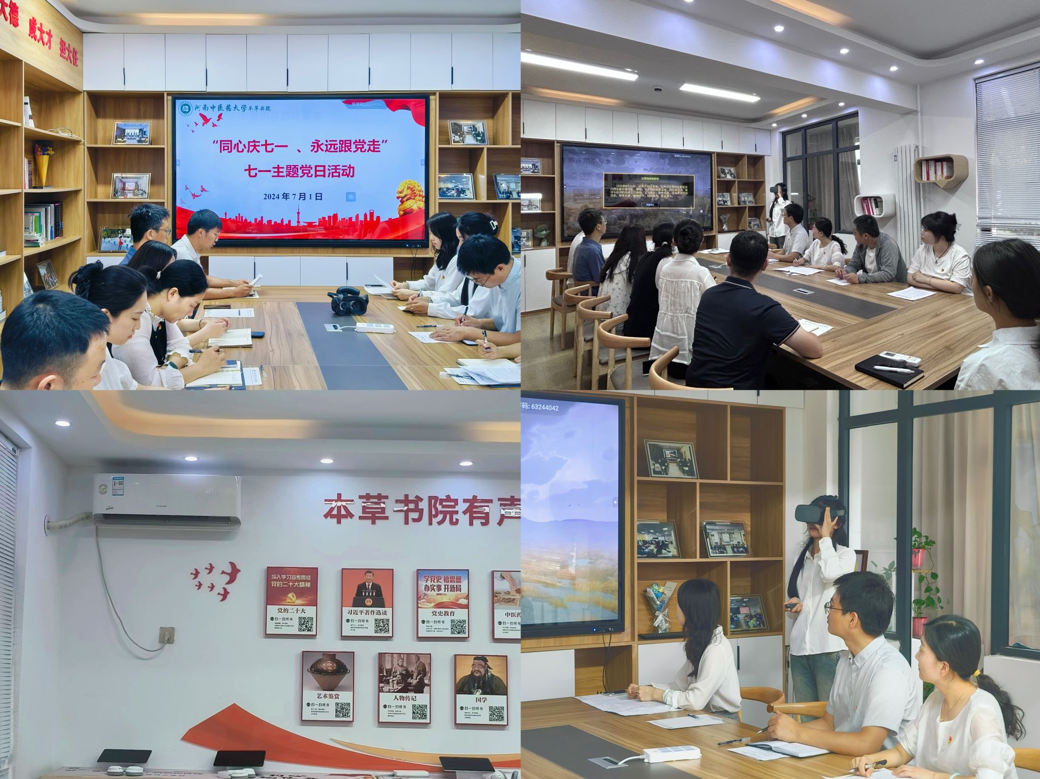 红色基因永延续,精神火炬长传递。2024年7月1日,本草书院在八号楼学生社区智慧党建活动室开展“同心庆七一,永远跟党走”主题党日活动。活动以“浸润式”微党课为内容,师生通过VR眼镜身临其境体验了红军爬雪山、过草地的艰辛,切实体悟那段艰苦卓绝的历史,学习革命前辈的奋斗精神。