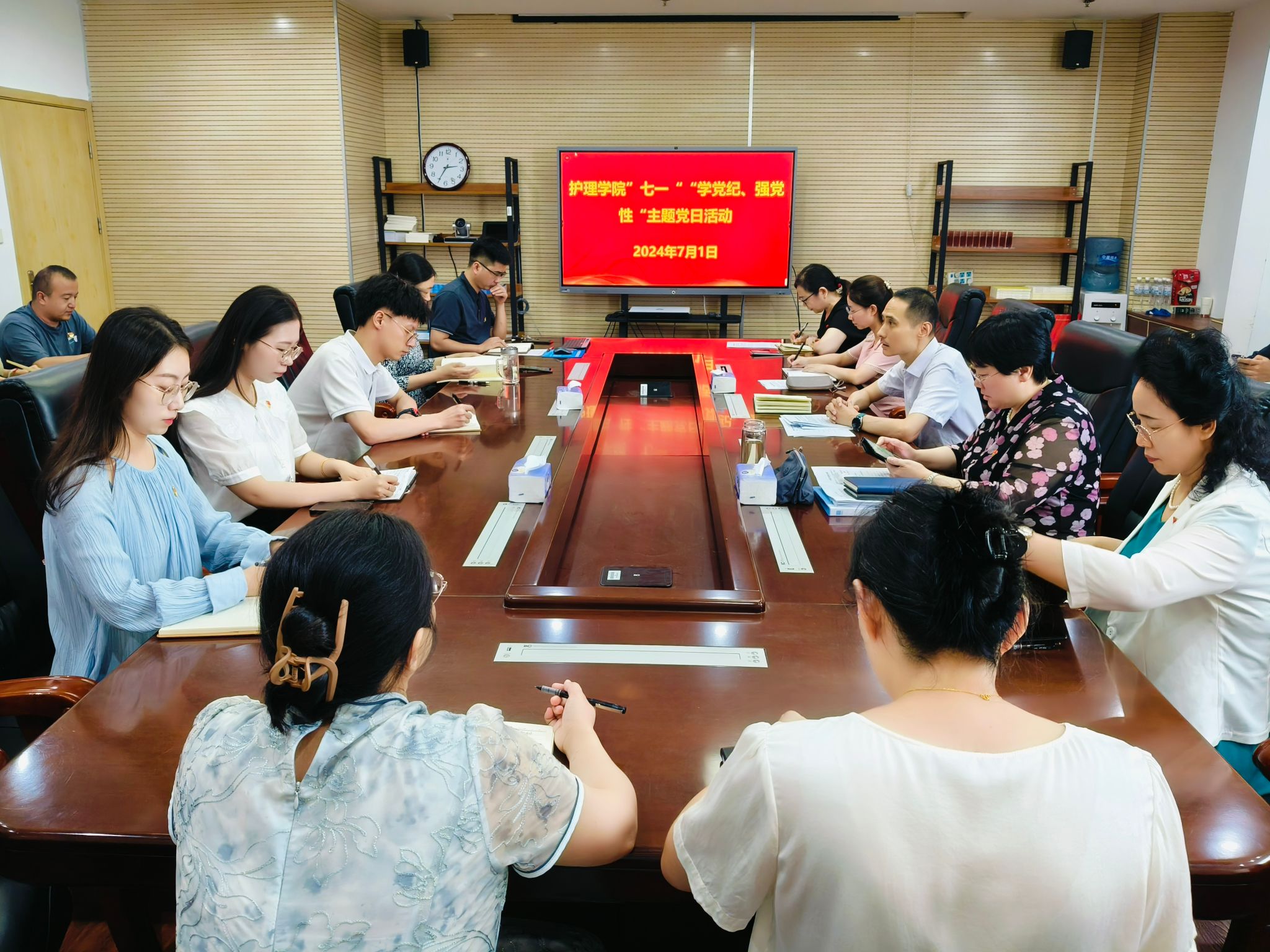 本网讯(文/图 张璟)2024年7月1日,护理学院在BS704会议室及“治未病”廉政教育园地举办“七一”“学党纪、强党性”主题党日活动。护理学院领导班子及全体教职工参加活动,活动由学院党委书记牛乐主持。