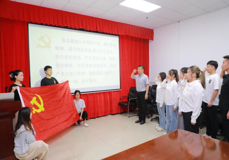 集体宣誓,誓言永恒。马克思主义学院党委副书记郭伦带领新发展党员高举右拳面向党旗庄严宣誓,全体党员同志在鲜红的党旗前,再次许下铮铮誓言。誓言虽短,字字千钧,声声誓言化作激励全体党员同志砥砺前行的不懈力量。