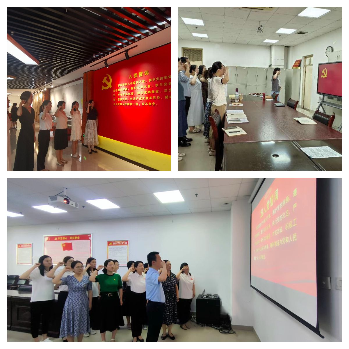 学院英语专业教研室党支部、公共外语教研室党支部、行政党支部和翻译、汉教教研室联合党支部均开展了重温入党誓词活动,各支部党员教师面向党旗,高举右手庄严宣誓,立下自己对党忠诚的誓言、为党的事业奋斗终生的决心。