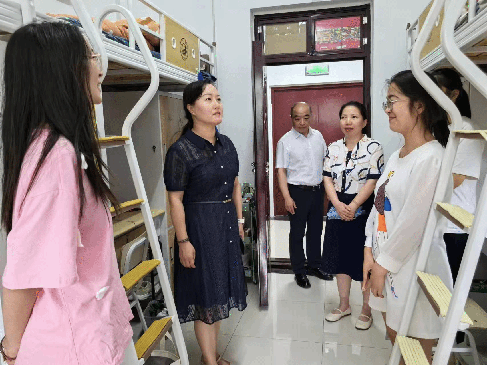 本网讯(文/图 努尔比耶)为全面了解暑期留校学生学习生活情况,更好把握同学们的思想动态,2024年7月15日中午,党委学工部、研工部常务副部(处)长、武装部部长郭婧带队,党委学工部、研工部、武装部副部长范凯,党委学工部、研工部副部长李京华及龙子湖校区学工值班老师,一起深入留校本硕博学生宿舍,为同学们送去学校的深切关怀和问候。