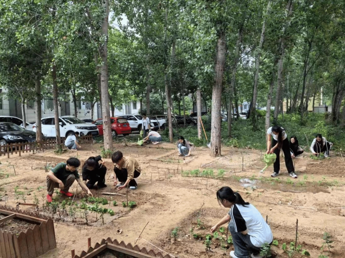 学生进行浇水、除草劳动