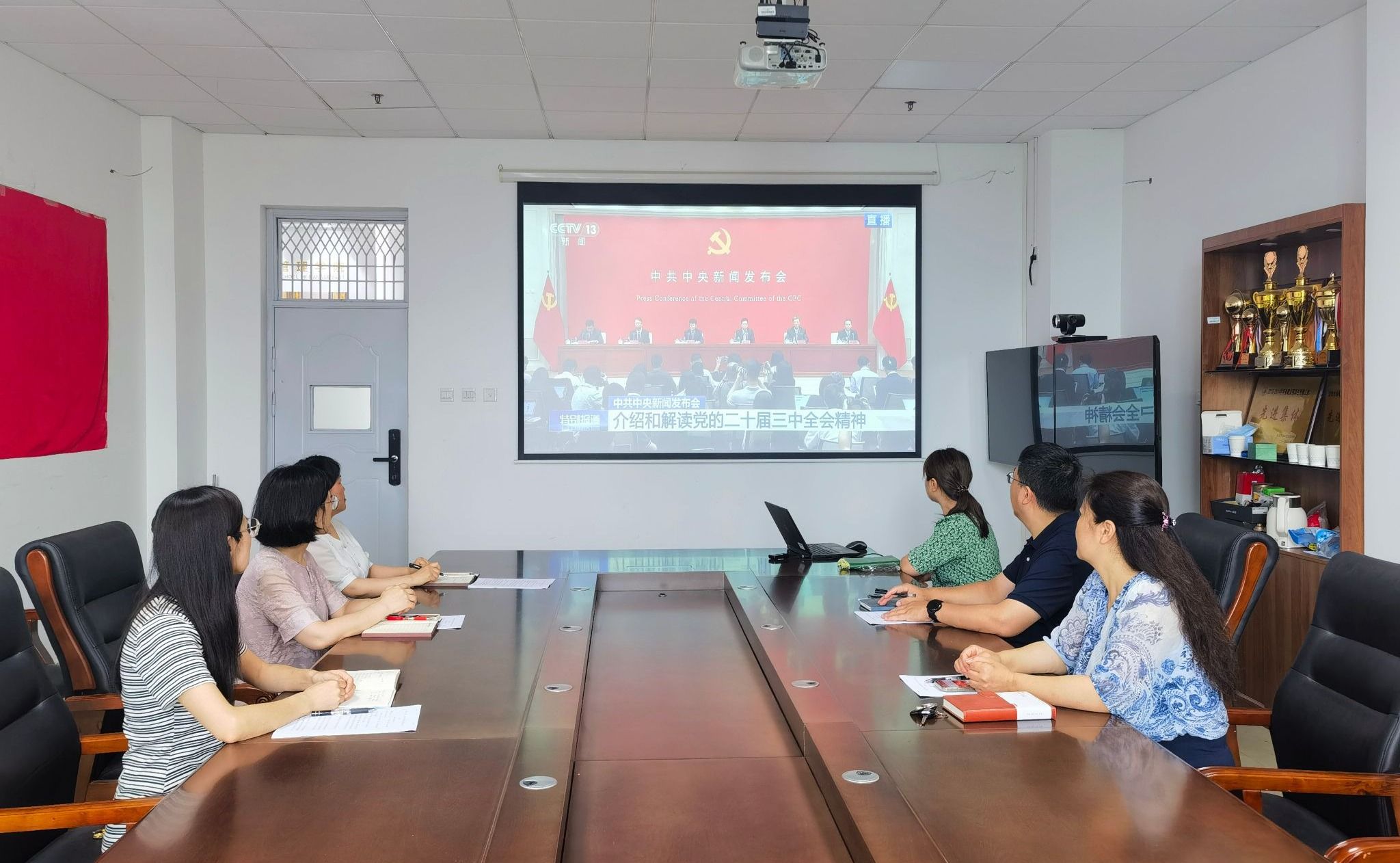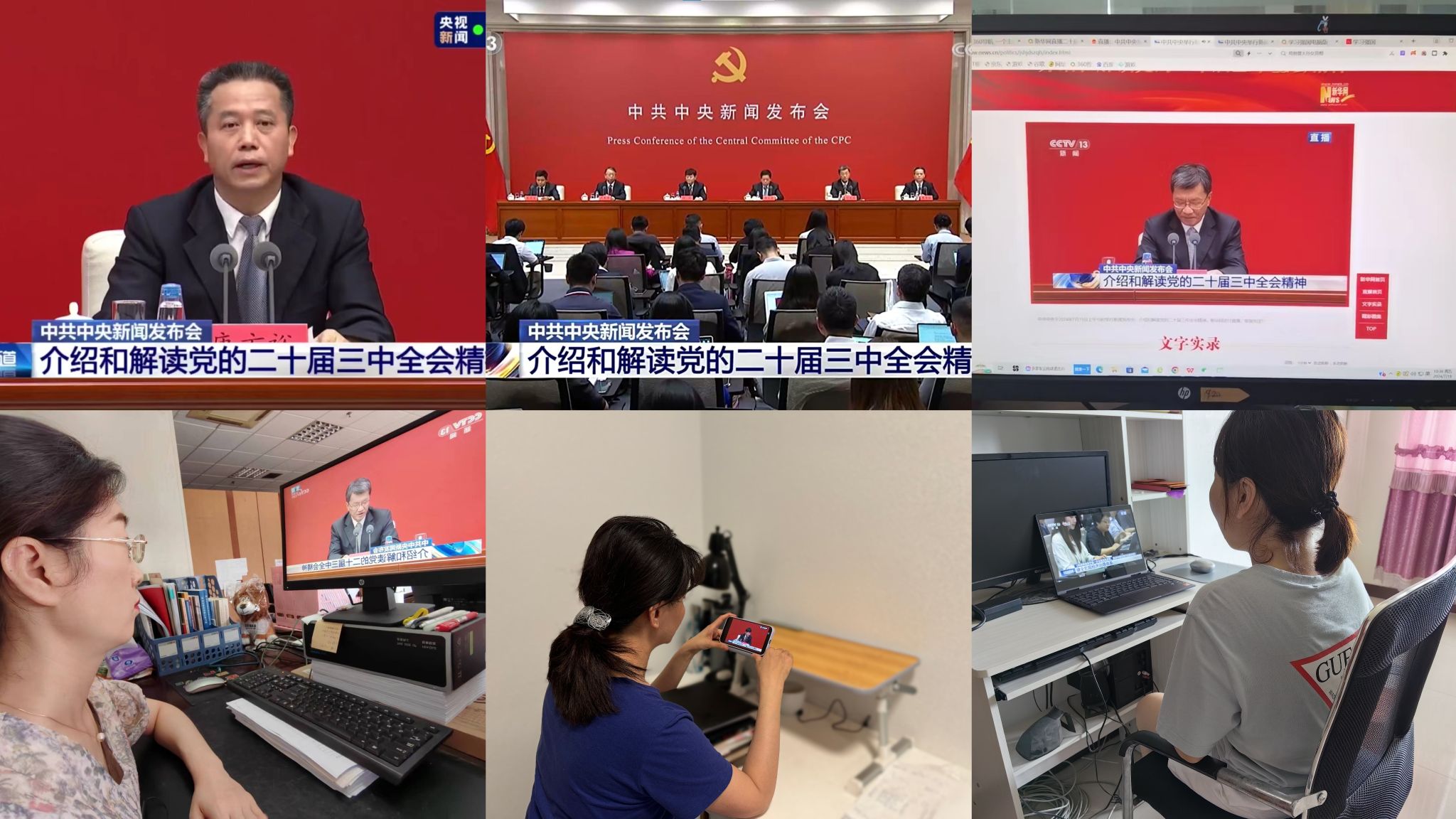 本网讯(文/黄璐 图/高婷)为深入学习贯彻党的二十届三中全会精神,2024年7月19日上午,管理学院党委组织全体党员以不同形式对中共中央举行的新闻发布会“介绍和解读党的二十届三中全会精神”现场直播进行专题学习。班子全体成员在教学综合实验大楼A542集中收看学习,各党支部以线上形式组织党员观看学习。