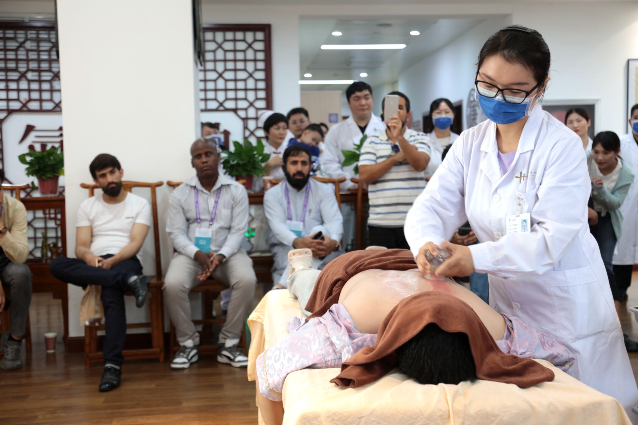 在二附院传统诊疗中心中医护理门诊非药物疗法操作区,培训班学员满怀好奇地亲身体验了雷火灸这一古老而神奇的疗法,感受温热与疗愈的力量。随后,他们踏入针灸推拿科,体验了针灸、推拿等传统中医特色疗法,其中宋永达副主任的中医正骨技法让体验者赞叹不已,此时的他们对中医的神奇疗效有了更直观、深刻的体悟。