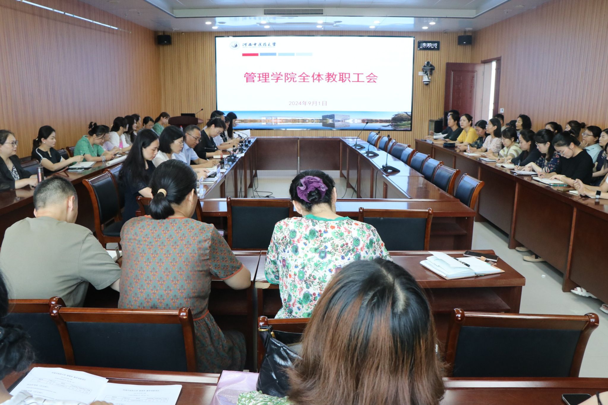 本网讯(文/黄璐 赵聪慧 图/胡晓勇)2024年9月1日,管理学院秋季新学期全体教职工会在教学实验大楼BM801召开。会议由党委副书记毛海燕主持。