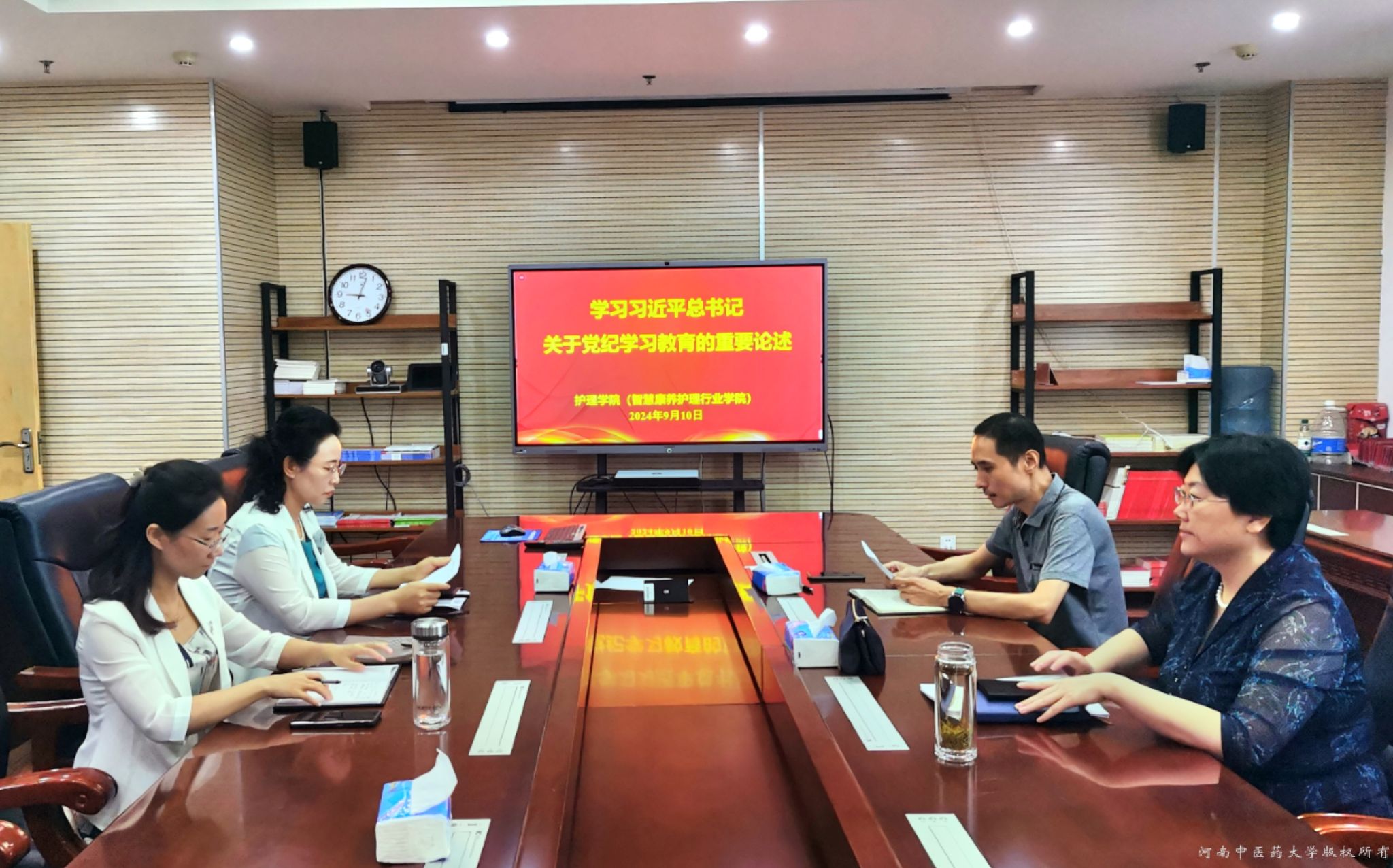 本网讯(文/杨晓 图/张琼)近日,护理学院于BS704会议室召开党委理论学习中心组会议,学习习近平总书记关于党纪学习教育的重要论述,会议由党委书记牛乐主持,护理学院领导班子参加会议。