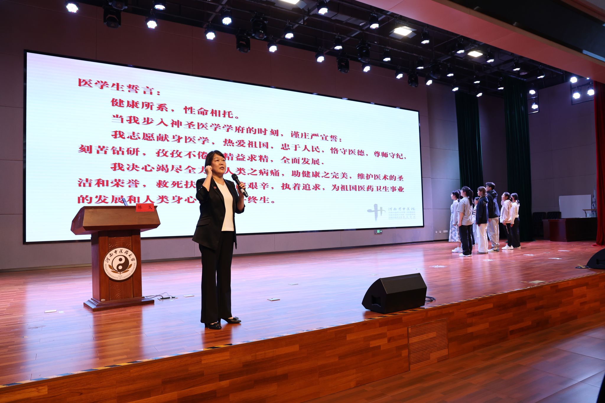 典礼在庄严雄壮的国歌声中拉开帷幕。冯志毅首先宣读了军训先进个人名单并颁发荣誉证书,激励大家继续发扬坚韧不拔、团结协作、勇于挑战的军训精神。随后,李俊芝向新生代表赠送中医经典《黄帝内经》,希望同学们传承知识,心怀医者仁心,精研医道,努力成才。李俊芝还带领全体新生齐声宣读医学生誓词,铿锵有力的誓言表达了同学们为献身祖国医学事业的坚定决心。