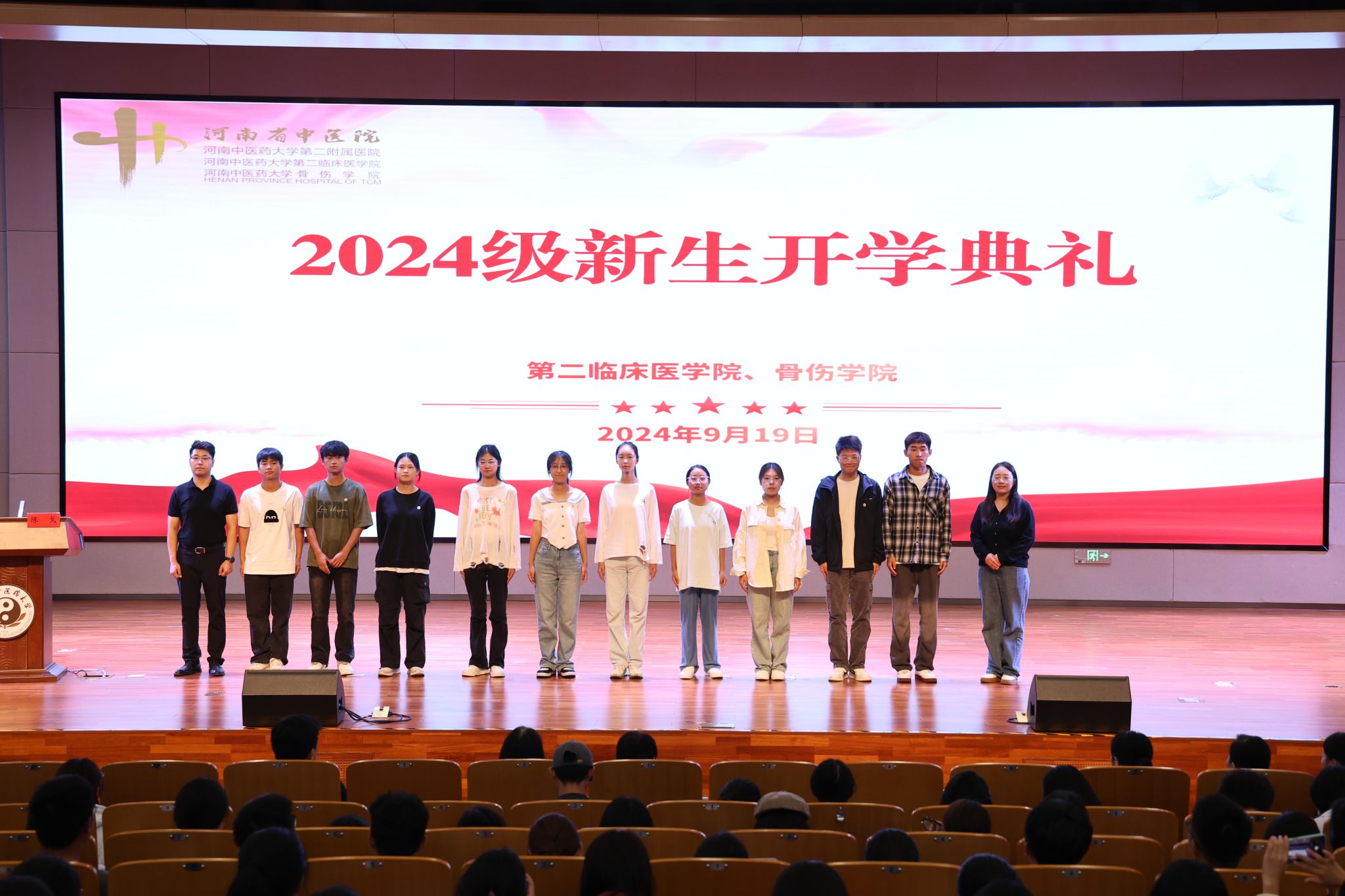 新生代表、第二临床医学院2024级中医养生班张沁馨、骨伤学院2024级中医骨伤科学本科一班张明泽作在发言中表示,要坚守医学初心、刻苦学习,不懈努力、追求卓越,不辜负老师和家长的期望,为中医事业贡献自己的力量。典礼还进行了授校徽环节。新生辅导员李亮、乔利楠两位老师作为教师代表为新生颁发校徽。授予校徽,这不仅仅是一个简单的仪式,更是大学精神的传承与纪念,更是对同学们成为学院大家庭一员的认可与期待。