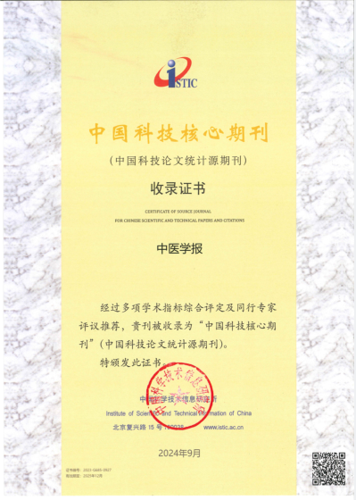 本网讯(文/图 纪彬)2024年9月20日,科学技术部中国科学技术信息研究所在北京召开“2024年中国科技论文统计结果发布会暨中国一流科技论文世界影响力评价论坛”,发布《2024版中国科技期刊引证报告(核心版)自然科学卷》和《2024版中国科技期刊引证报告(核心版)社会科学卷》。《中医学报》经过多项学术指标综合评定及同行专家评议推荐,再度被收录为“中国科技核心期刊”(中国科技论文统计源期刊)。这是该刊连续第18次被收录。