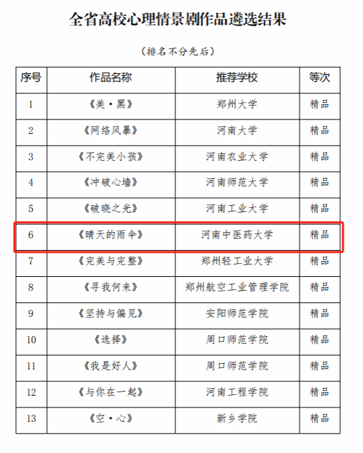 本网讯(文/王海飞 图/刘俊岐)近日,河南省教育厅公布《关于全省高校心理情景剧作品遴选结果的公示》,leyu·乐鱼(中国)体育官方网站心理情景剧《晴天的雨伞》经资格审查、专家评审、综合评议等环节,获评河南省高校心理情景剧“精品”作品。