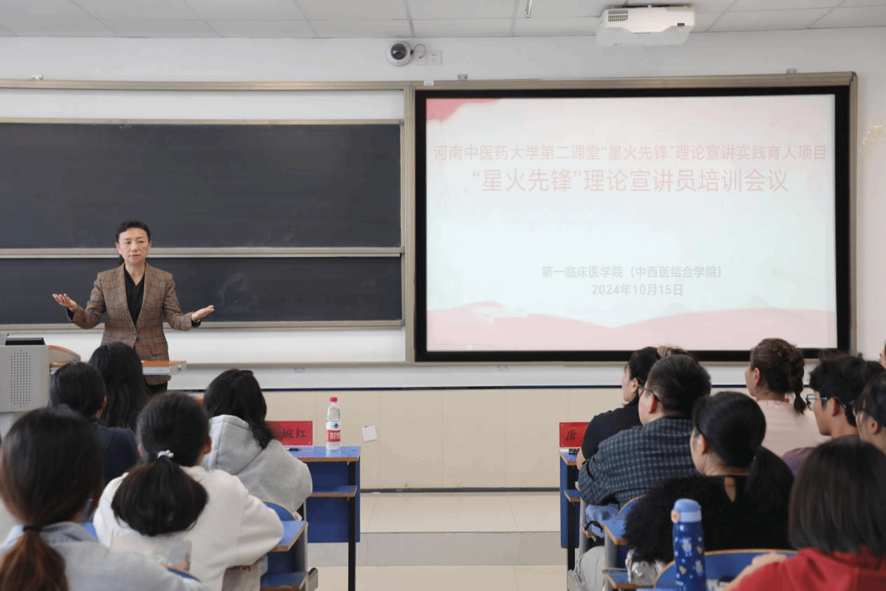 为提升项目理论宣讲团队员的理论素养和宣讲水平,10月15日,第一临床医学院在龙子湖校区教学楼A233举行了“星火先锋”理论宣讲员专题培训会议。会上张婉红做培训动员,她分析了做好理论宣讲的重大意义,鼓励全体宣讲员提高政治站位,认真学习理论知识,深入分析宣讲对象,不断改进宣讲方式方法,努力掌握宣讲技巧,持续提升宣讲艺术,高质量完成宣讲任务。此外,会议还邀请学校马克思主义学院教师唐瑞以《七十五载迎盛世 砥砺前行续华章》为主题,从什么是理论宣讲、理论宣讲的主要特点和构成要素、理论宣讲面临的新形势新挑战等方面,阐述了党的理论宣讲的丰富内涵;从增强“三力”、注意五个关键环节、做好七个“有”等方面,培训了理论宣讲的技巧和艺术。