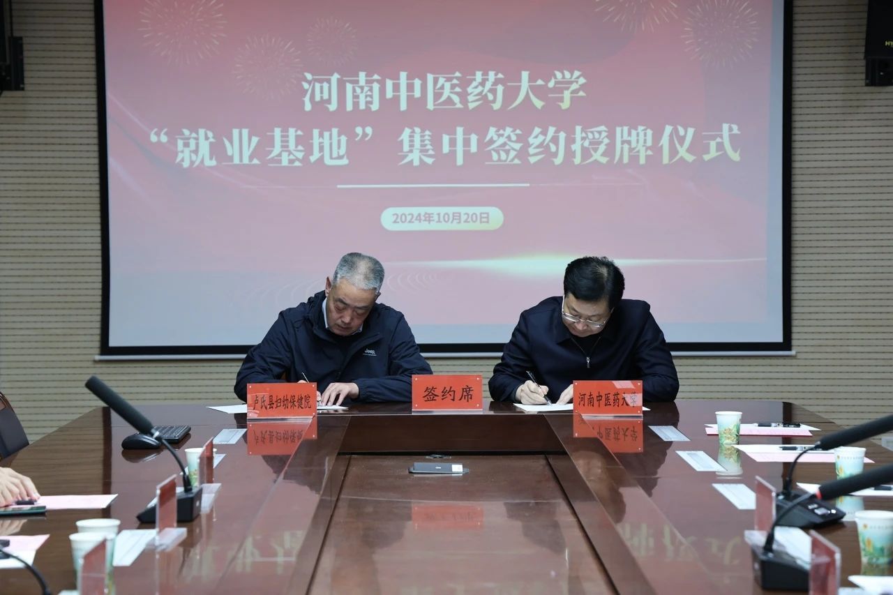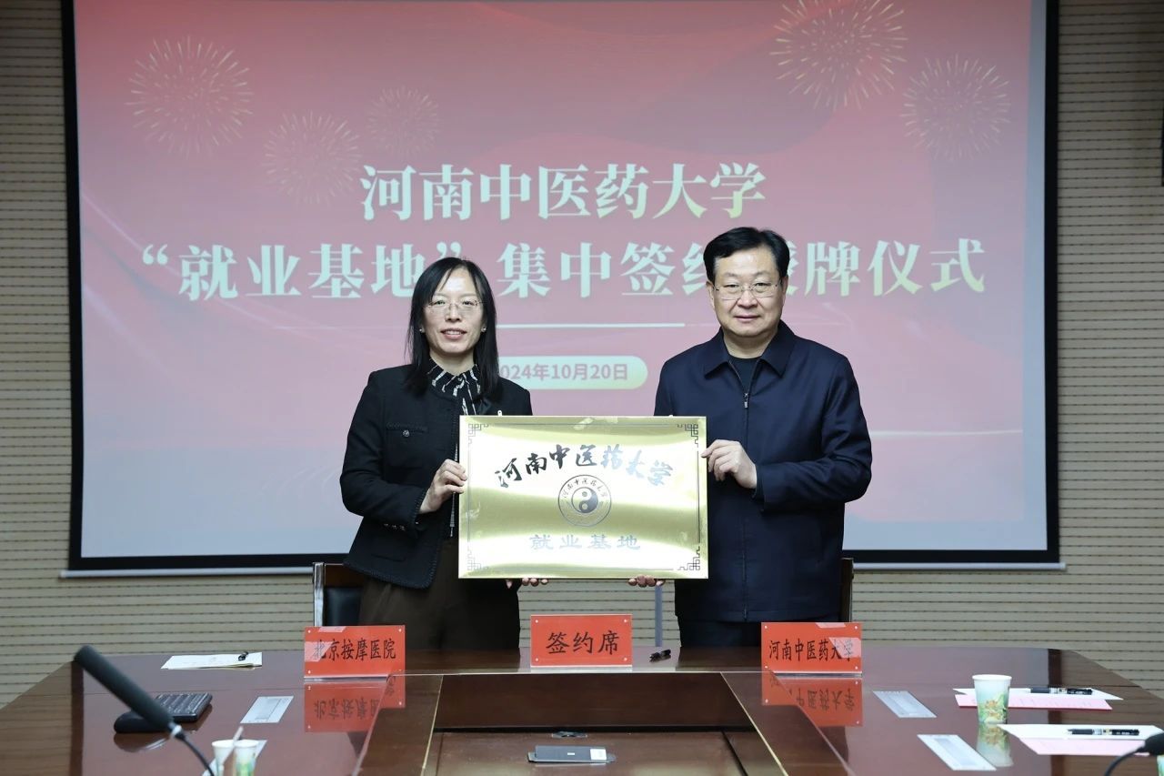 会上,刘金厂代表学院对用人单位的到来表示热烈欢迎,他详细介绍了学院的历史沿革、师资力量、办学特色、人才培养以及毕业生情况,希望以此次签约为契机,加强院企双方联系,深化产教融合,拓宽毕业生就业渠道,搭建毕业生高质量就业平台,共同促进中医药事业的发展。与会医院相关领导先后介绍了单位具体情况、人才需求等基本情况,纷纷表示将以此次“就业基地”签约授牌为契机,加强沟通合作,丰富合作内容,锁定优秀人才,与学院共同培养医疗领域的高素质应用型人才。随后,刘金厂依次与北京按摩医院、周口港区医院、卢氏县妇幼保健院等用人单位签订《leyu·乐鱼(中国)体育官方网站毕业生就业基地协议书》,并为各用人单位授牌。