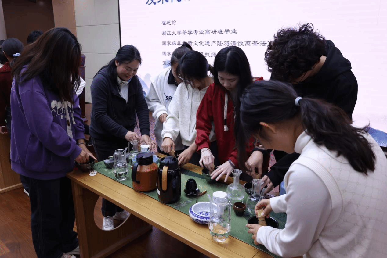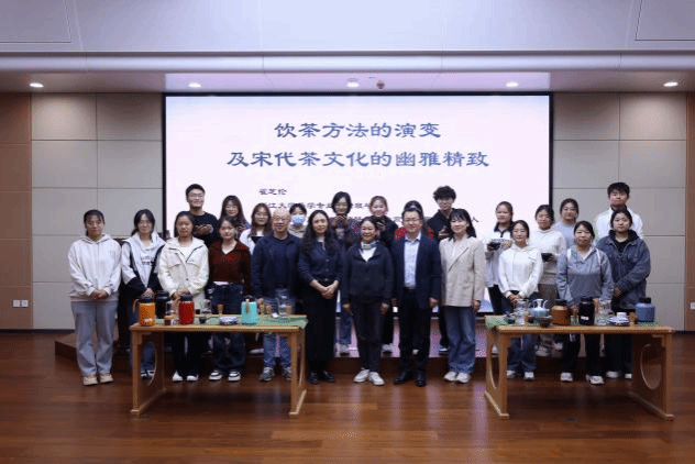 随后,翟芝伦老师以“饮茶方法的演变及宋代茶文化的幽雅精致”为主题带领现场师生走进了茶的奇妙世界。通过介绍茶的起源、发展历程和饮用方法等知识,展示了茶文化的独特魅力,引导同学们思考茶文化的传承与创新。为了让同学们更直观地感受宋代茶文化的魅力,讲座还特别安排了体验环节。在翟老师的指导下,同学们亲自动手体验了点茶过程。通过研磨茶叶、调配茶汤到最后的品鉴,不仅加深了对宋代茶文化的理解,也感受到了中国传统文化的深厚底蕴。