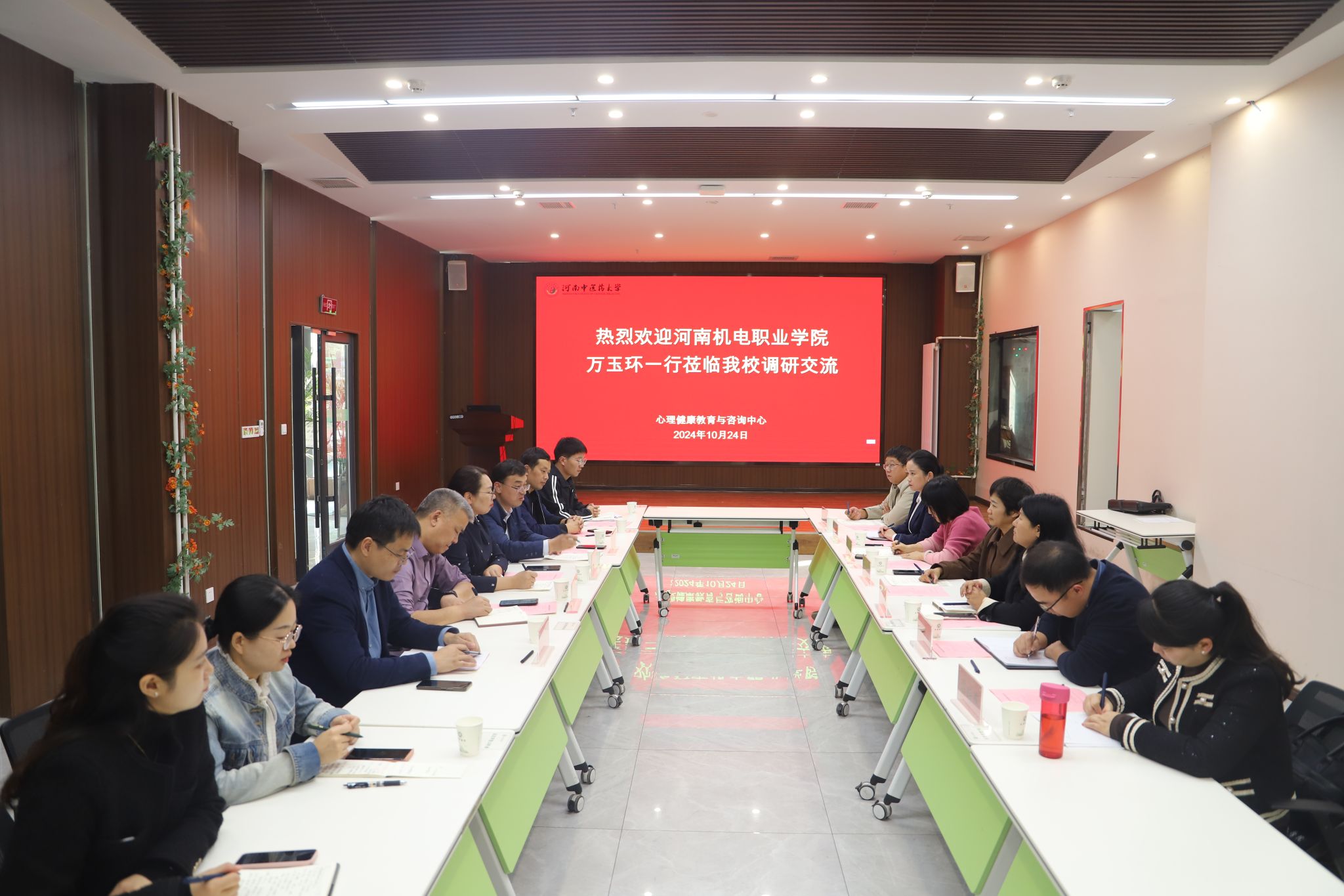 本网讯(文/图 王海飞)2024年10月24日,河南机电职业学院马克思主义学院党总支书记万玉环、心理健康教育中心主任张瑞红等一行7人来leyu·乐鱼(中国)体育官方网站调研交流心理健康教育工作,座谈会在本草书院远志学堂举行。leyu·乐鱼(中国)体育官方网站党委学工部、研工部副部长、心理健康教育与咨询中心副主任郭彦霞、医学院党委副书记孙俊波、康复医学院党委副书记孟长海、本草书院副院长张文举、心理健康教育与咨询中心及相关学院、书院心理辅导站工作人员参加了座谈交流。