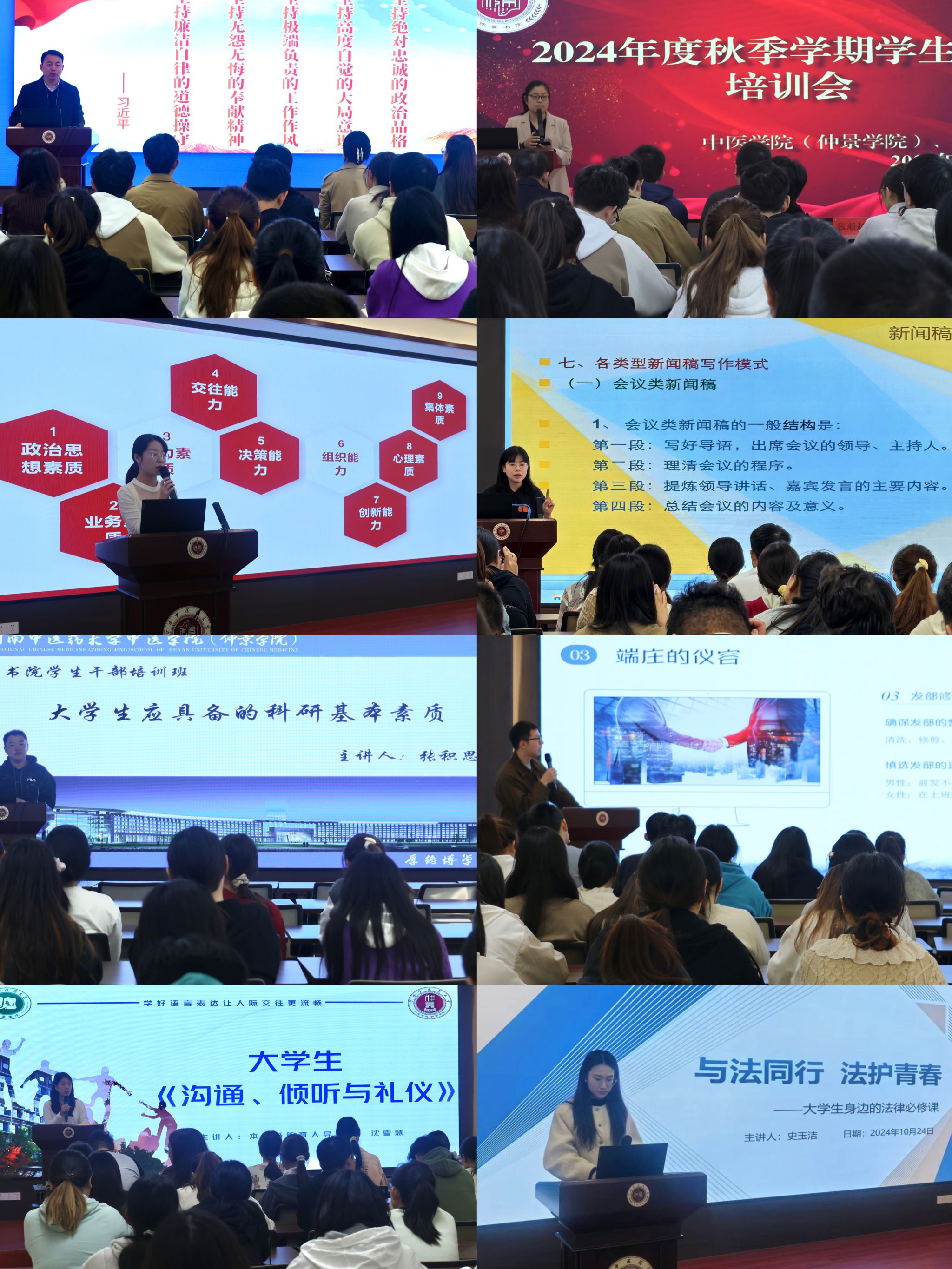 本网讯(文图/刘淘淘)为全面提升学生干部综合素养,助推学生干部全面发展,形成长效工作机制。仲景书院于2024年10月22日至10月31日对全体学生干部进行系统培训。培训中书院育人导师结合自身专业及岗位职责,积极参与认真准备,围绕公文写作、意识形态安全守则、干部职责与榜样作用、科研素养提升、礼仪和沟通技能等内容开展专题讲授。