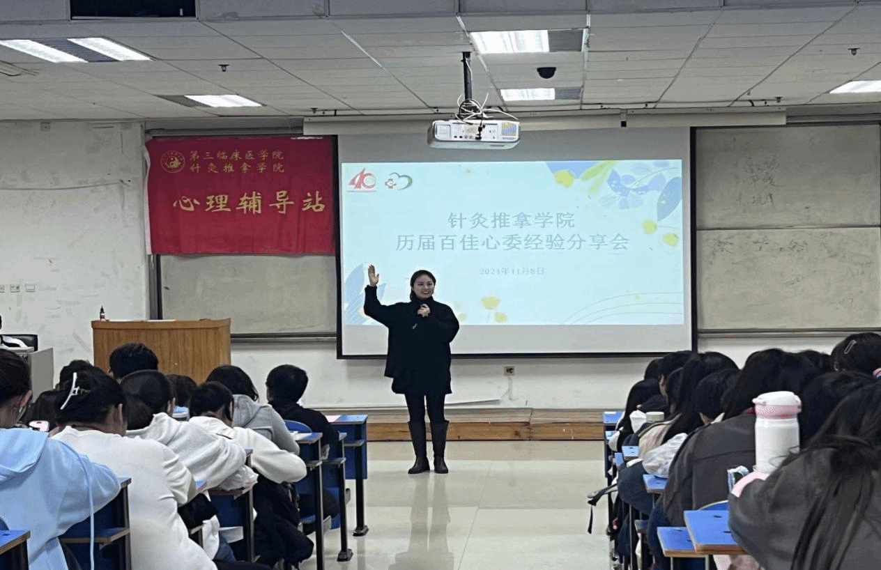 本网讯(文/图 李映月 葛昕)适逢第三附属医院、针灸推拿学院建院四十周年,为积极响应大学生心理中心号召,加强院系朋辈心理服务队伍的建设,2024年11月8日,针灸推拿学院举办历届全国“百佳心委”经验分享会,旨在加强朋辈心理服务队伍建设。会议特邀校心理健康教育与咨询中心刘俊岐老师及院团委书记葛昕出席,会议由院心理辅导站负责老师李映月主持。