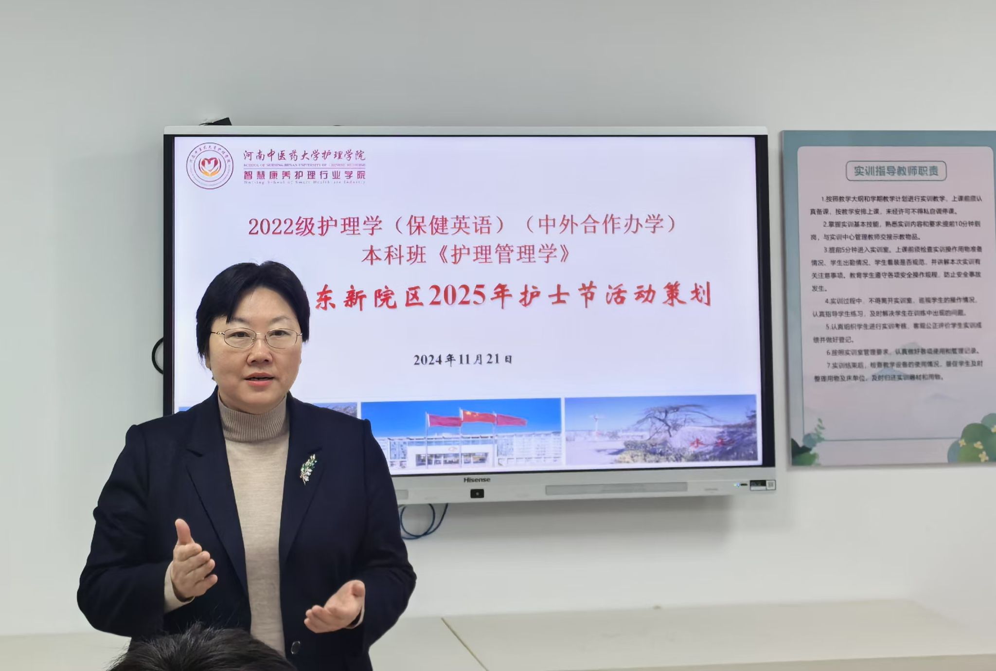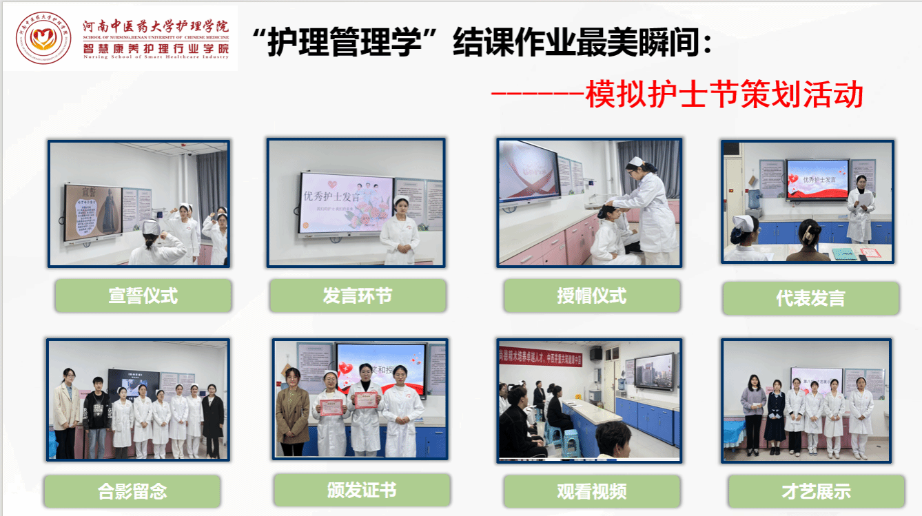 11月16日,教学名师工作室负责人、护理学院(智慧康养护理行业学院)院长秦元梅依托腾讯会议平台组织团队成员认真学习研讨了教学名师工作室建设任务书课程思政教学要求,制定了《护理管理学》第三次实训课程的详细计划和课程安排。与授课教师及研究生助教就本课程教学创新、授课流程、教学方式、材料准备等问题进行了深入交流。11月21日,授课教师张岩、吕会洁携研究生助教谢雨璐、孟家如分别在BN707、BM702顺利开展以“我们的护士,我们的未来”为主题的模拟护士节策划活动。授课过程中,各学生小组根据不同角色分工,通过代表发言、授帽仪式、宣誓仪式、颁发证书、才艺展示等环节进行汇报展示,生动呈现了护理人员的专业形象与团队精神,进一步提高了学生对护士职业的认可度。