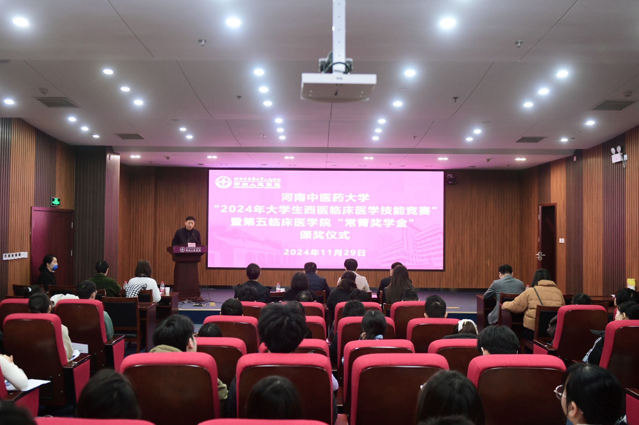 本网讯(文/夏文娜 图/孙芸昊)2024年11月29日,“leyu·乐鱼(中国)体育官方网站2024年大学生西医临床医学技能竞赛暨第五临床医学院‘常菁奖学金’颁奖仪式”在文化路校区科研教学中心一楼会议室隆重举行。学校社会合作办公室副主任施淼,郑州市大肠肛门病医院副院长宋聚才、党办主任梁志平、教学办主任刘全林,第五临床医学院班子成员、职能部门及学生代表近100人参加,仪式由leyu·乐鱼(中国)体育官方网站人民医院副院长田明波主持。