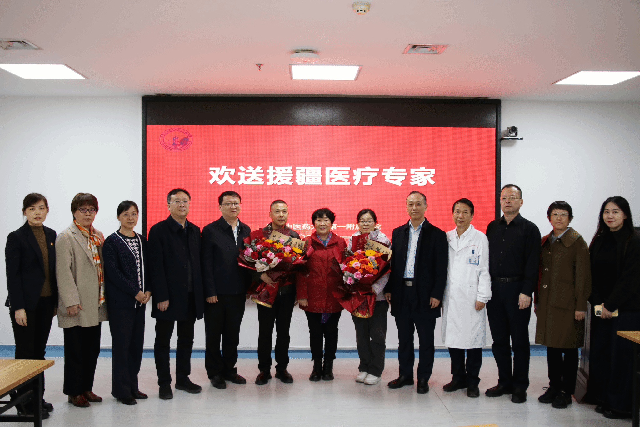 本网讯(文/李梦龙 图/罗龙龙)近日,一附院召开援疆医疗专家欢送会,为代表医院参加第十一批援疆任务的专家——传统疗法科副主任医师赵计轩、儿科副主任医师马丽娜饯行。国医大师丁樱教授,医院党委书记任献青,党委副书记董新刚等在院领导,及党委办公室、人事部、医务部及派出科室负责同志参加仪式,共同为援疆专家送行。