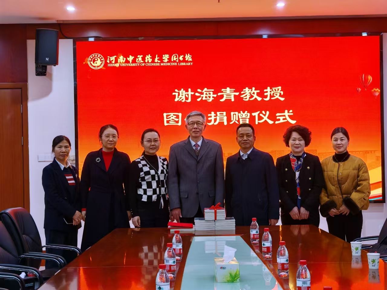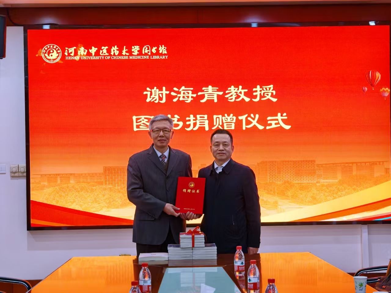 本网讯(文/图 郭豪)冬藏神州蓄锐日,春晖大地报恩时。2024年12月17日,国医大师李振华教授关门弟子、leyu·乐鱼(中国)体育官方网站84级校友谢海青教授向leyu·乐鱼(中国)体育官方网站图书馆捐赠《调脾胃治杂病——谢海青急症疑难病诊疗经验专辑》中文版15册、英文版1册,图书馆馆长何明举接收捐赠图书并颁发了捐赠证书。图书馆副馆长吴晓萍、范文博及社会合作办公室校友与社会合作科科长陈晓辉、图书馆办公室、图书馆采编部有关同志参加了捐赠仪式。