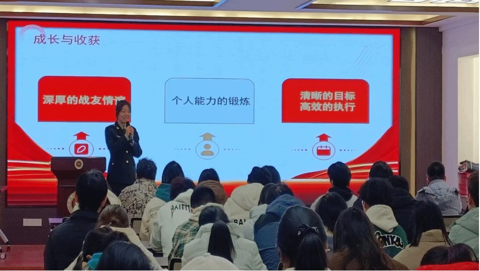 宣讲会伊始,李佳慧同学表演了暖场戏剧——《花木兰》选段,带领现场观众重温历史,感受古代女英雄花木兰替父从军、保家卫国的巾帼豪情。在热烈的氛围中,赵鑫分享了自己投身军旅的初心,叙述了自己从初入军营时懵懂青涩,到逐步适应军中生活,进而领略到深刻意义的心路历程。她真切的感慨:“虽然很苦很累,但参军带给我的更多是成长。”随后,赵鑫解读了2025年学校征兵政策,并解答了同学们有关参军入伍的疑问。最后,现场观众一同观看了央视军事《2025年征兵宣传片》、河南省征兵宣传片《青春筑梦 强军有我》,进一步感受了军队风貌与军人英姿。