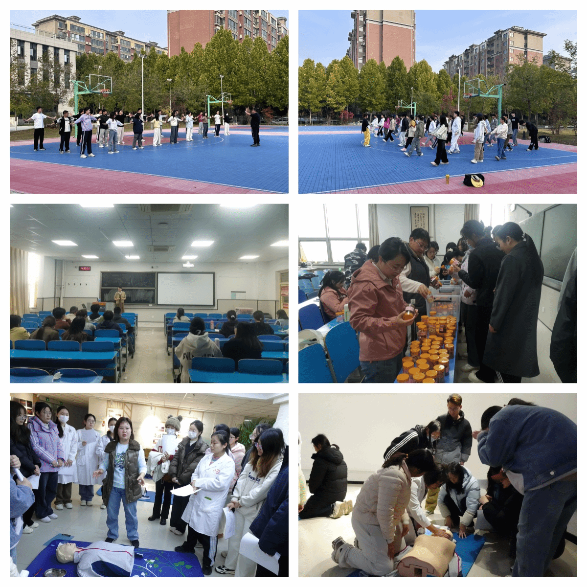 本次活动包含中医药养生保健操术训练、中医药物辨识及方剂调剂技能训练、医学救护基本技能训练三个项目。其中中医药养生保健操术训练项目邀请体育健康学院刘冰、王静2位老师分别为学生教授“五禽戏”和“易筋经”。两位老师凭借丰富的教学经验和深厚的功底,将传统养生保健操与中医理论相结合,让学生在锻炼身体的同时,领悟中医养生的智慧。同学们积极参与,现场气氛活跃,纷纷表示通过学习养生保健操,既增强了体质,又加深了对中医文化的理解。