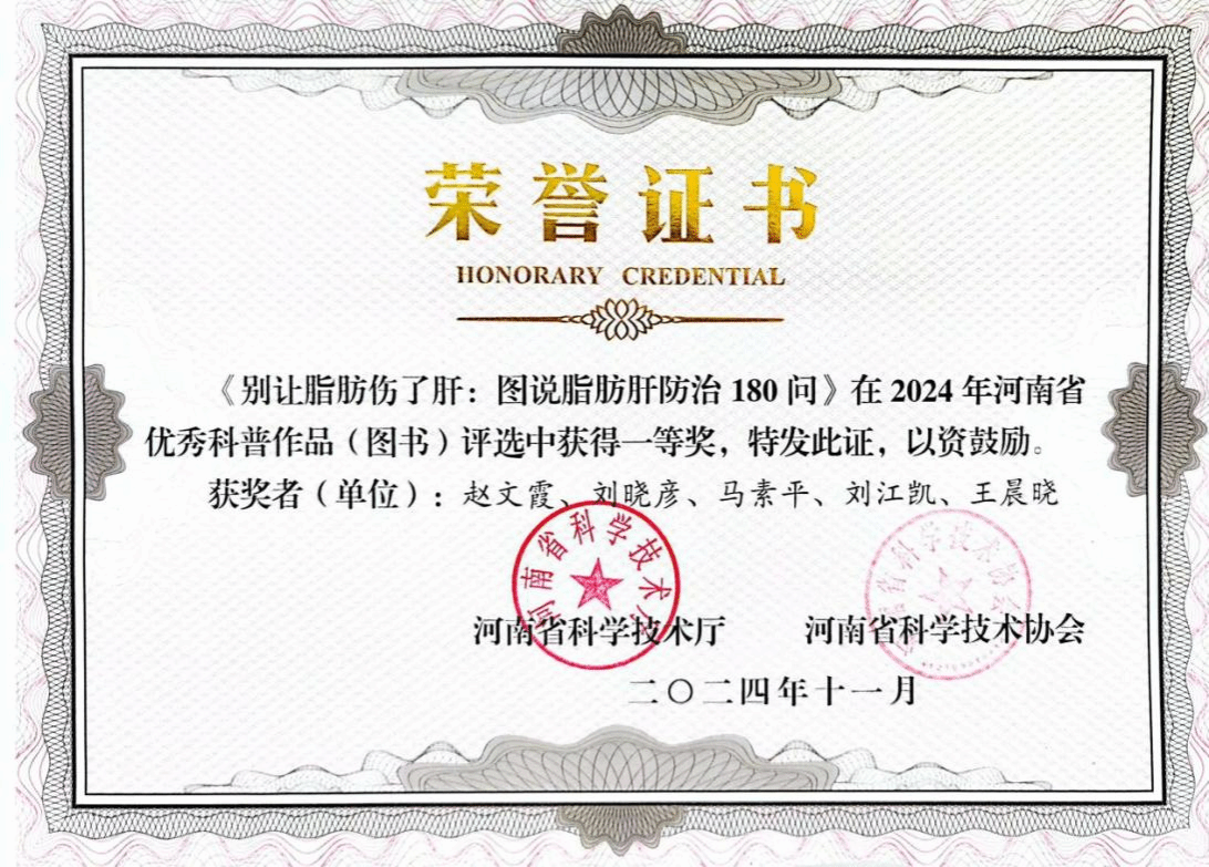 本网讯(文/图 冯超)近日,2024年河南省优秀科普作品(图书)评选活动结果公布。经过激烈角逐,一附院赵文霞团队所编写的《别让脂肪伤了肝:图说脂肪肝防治180问》从众多参评作品中脱颖而出,荣获一等奖。