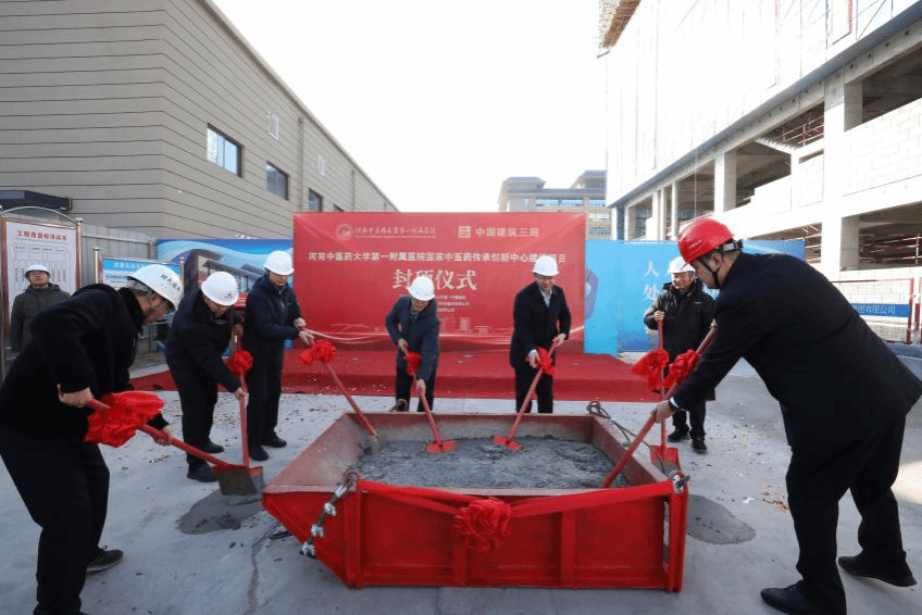 任献青代表医院宣布一附院国家中医药传承创新中心主体结构正式封顶,出席仪式的各位领导为主体结构浇筑最后一方混凝土。