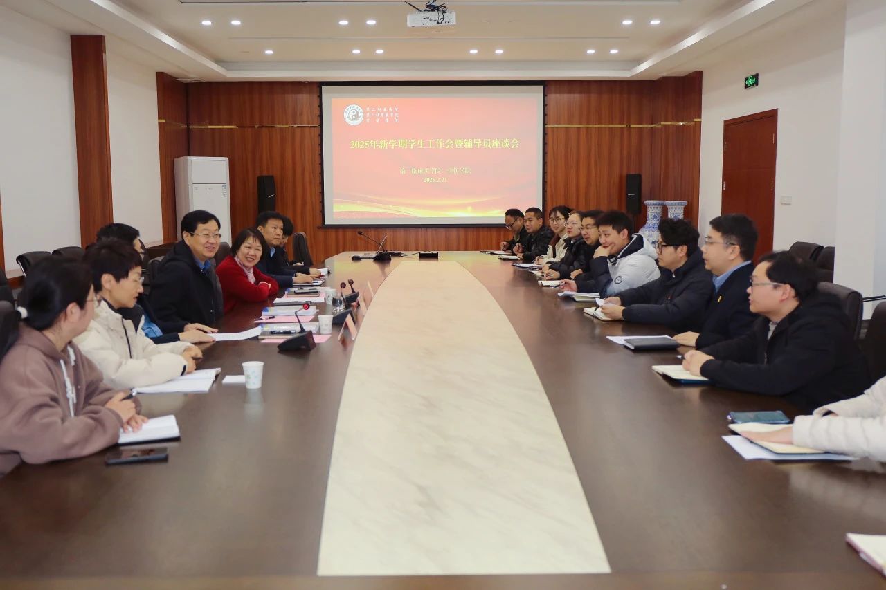 本网讯(文/王韵 图/程乾)为进一步提升学生工作质量,加强辅导员队伍建设,2025年2月21日,第二临床医学院、骨伤学院在东风路校区教学办公楼2楼会议室召开2025年新学期学生工作会暨辅导员座谈会,二附院、第二临床医学院、骨伤学院党委书记刘金厂,纪委书记李俊芝,党委副书记陈戈出席会议,全体学工人员参加会议。会议由陈戈主持。