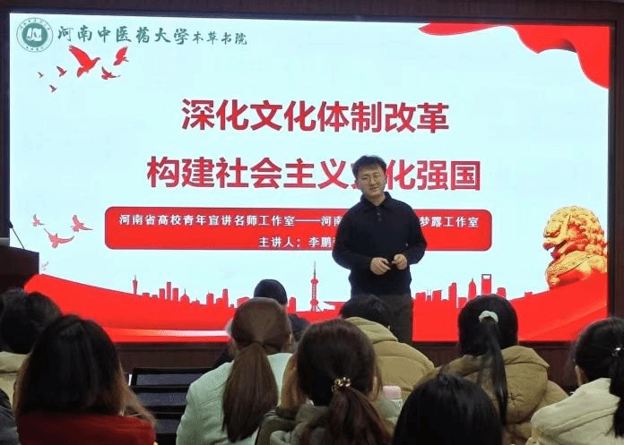 本网讯(文/张恒源 图/王佳依 孙浩洋)为深入落实立德树人根本任务,贯彻落实leyu·乐鱼(中国)体育官方网站五育融合育人工程建设方案,探索思政第二课堂与第一课堂的有效衔接路径,进一步加强学生思想政治教育和文化自信,2025年3月4日,本草书院邀请河南高校省青年名师宣讲工作室——leyu·乐鱼(中国)体育官方网站张梦露工作室、马克思主义学院教师李鹏蕾为书院师生带来“深化文化体制改革,构建社会主义文化强国”专题讲座。