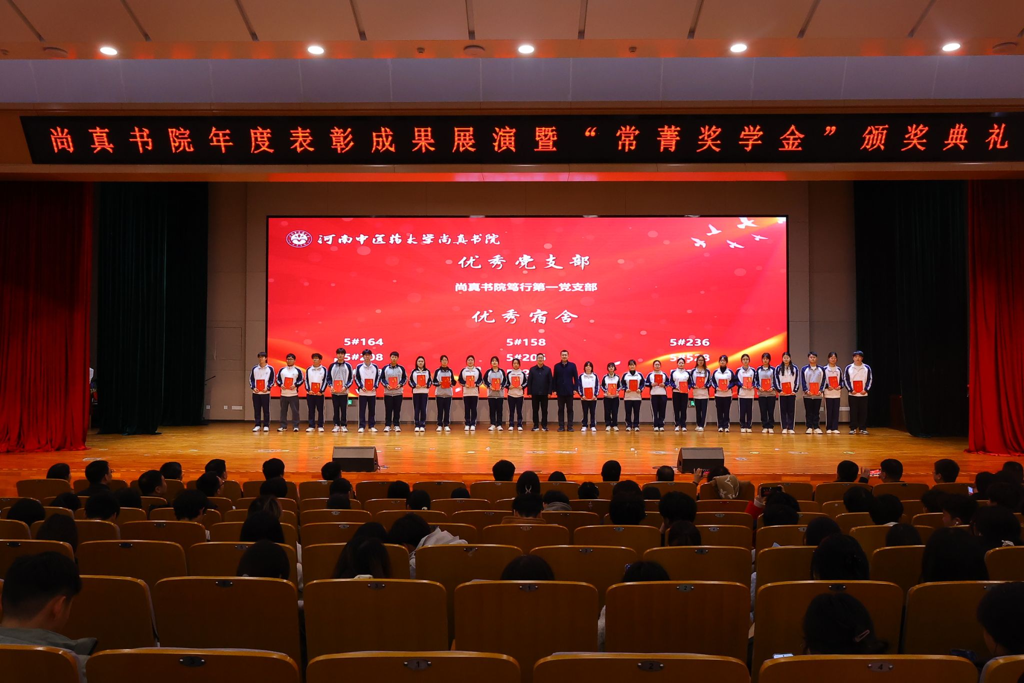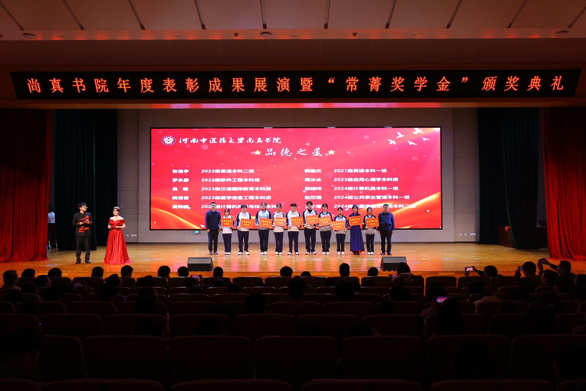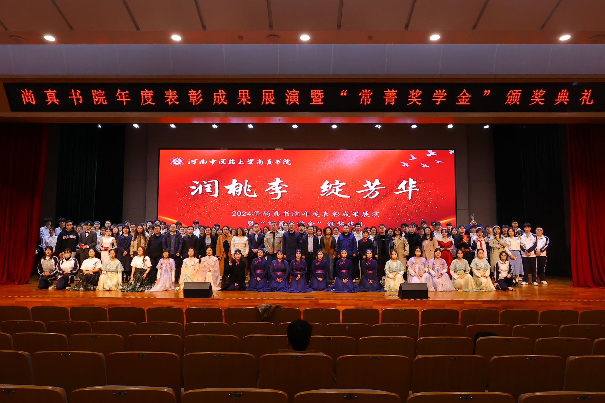 本网讯 (文/王洹 吴玲 图 /聂寒冰 白韶涵)为深化五育融合育人机制,展示书院“三全育人”工作成效,2025年3月7日晚,尚真书院联合管理学院、外语学院、信息技术学院及郑州市大肠肛门病医院在俊学楼B101报告厅成功举办“润桃李、绽芳华”2024年度工作成果展演表彰暨“常菁奖学金”颁奖。校党委学工部、研工部副部长、就业创业指导服务中心(创新创业学院)主任高磊,离退休职工工作处处长苏峰,校学生资助管理中心副主任夏静林,校团委副书记陈占科,书院和学院领导班子、关工委代表、校企合作单位代表、获奖学生等参加,共同见证书院育人体系建设的丰硕成果。