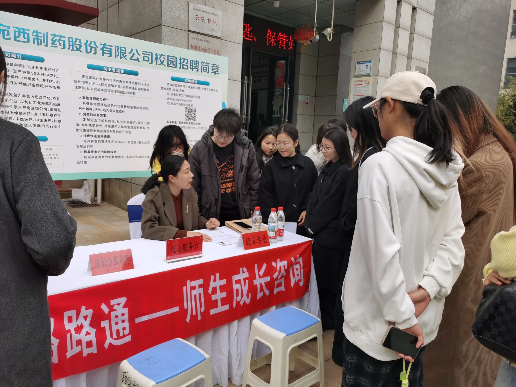 双选会创新模式,提前预热,精准对接就业需求。本次双选会采取了“线下展示+线上推送+现场招聘”的创新形式。为帮助学生提前做好职业规划、精准匹配岗位需求,本草书院在招聘会开始前两周便提前展出了20余家企业的招聘信息宣传展板,并在书院官网和小程序同步推送,使学生充分了解企业信息、岗位要求及发展前景。招聘会当天,各家企业在展板前设立招聘咨询点,与学生面对面交流,并同步进行简历投递和初步面试。这些展板还将在本草广场持续展出一个月,进一步延续招聘效应,持续为学生提供求职信息。