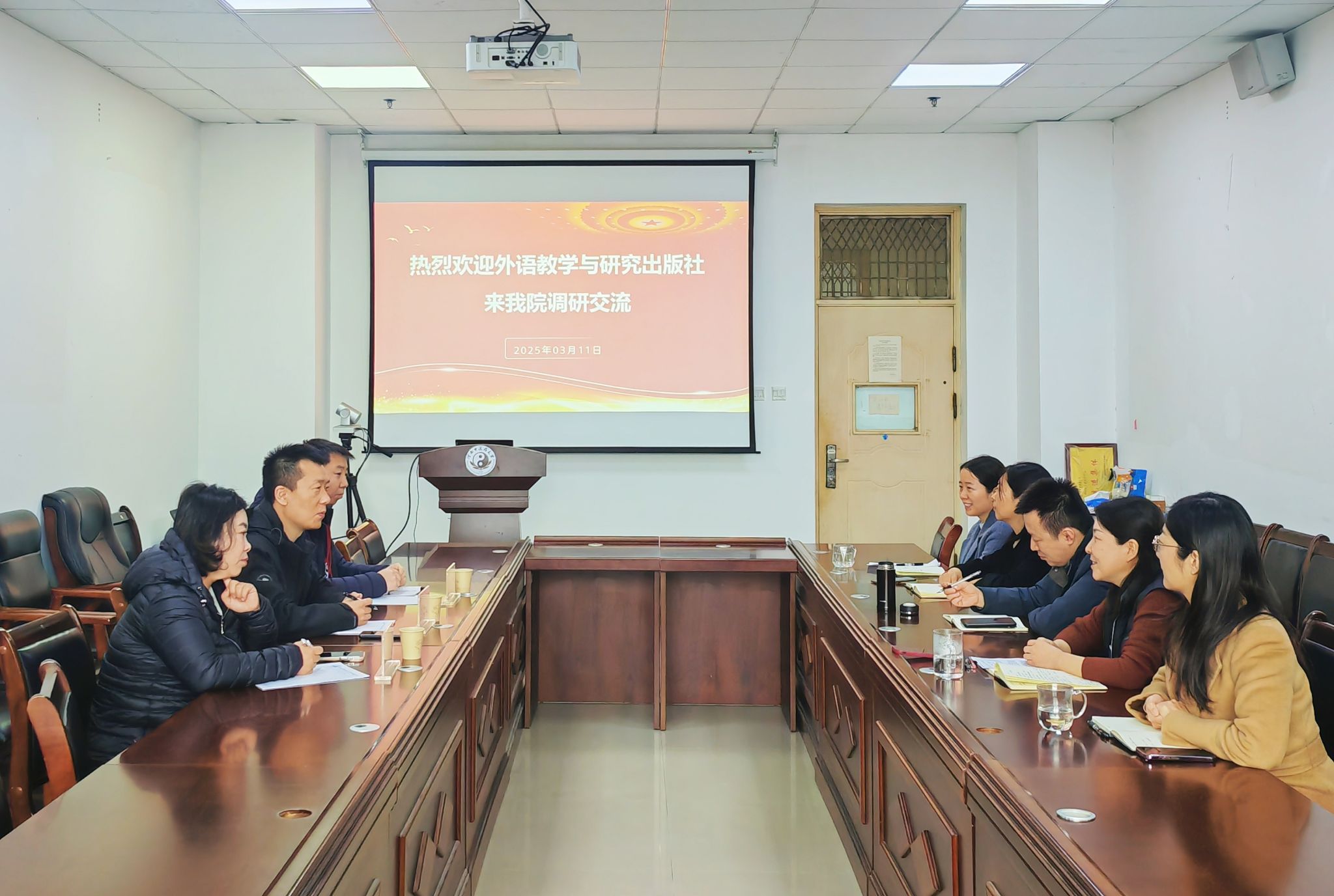 本网讯(文/图 胡志伟)2025年3月11日,外语教学与研究出版社河南区域负责团队一行到访外语学院。双方围绕人才培养、教材及教学资源建设、教学数智化转型、中医药国际化发展、教师教学发展规划等方面进行了交流。学院领导班子全体成员出席座谈会,院长朱文晓主持会议。